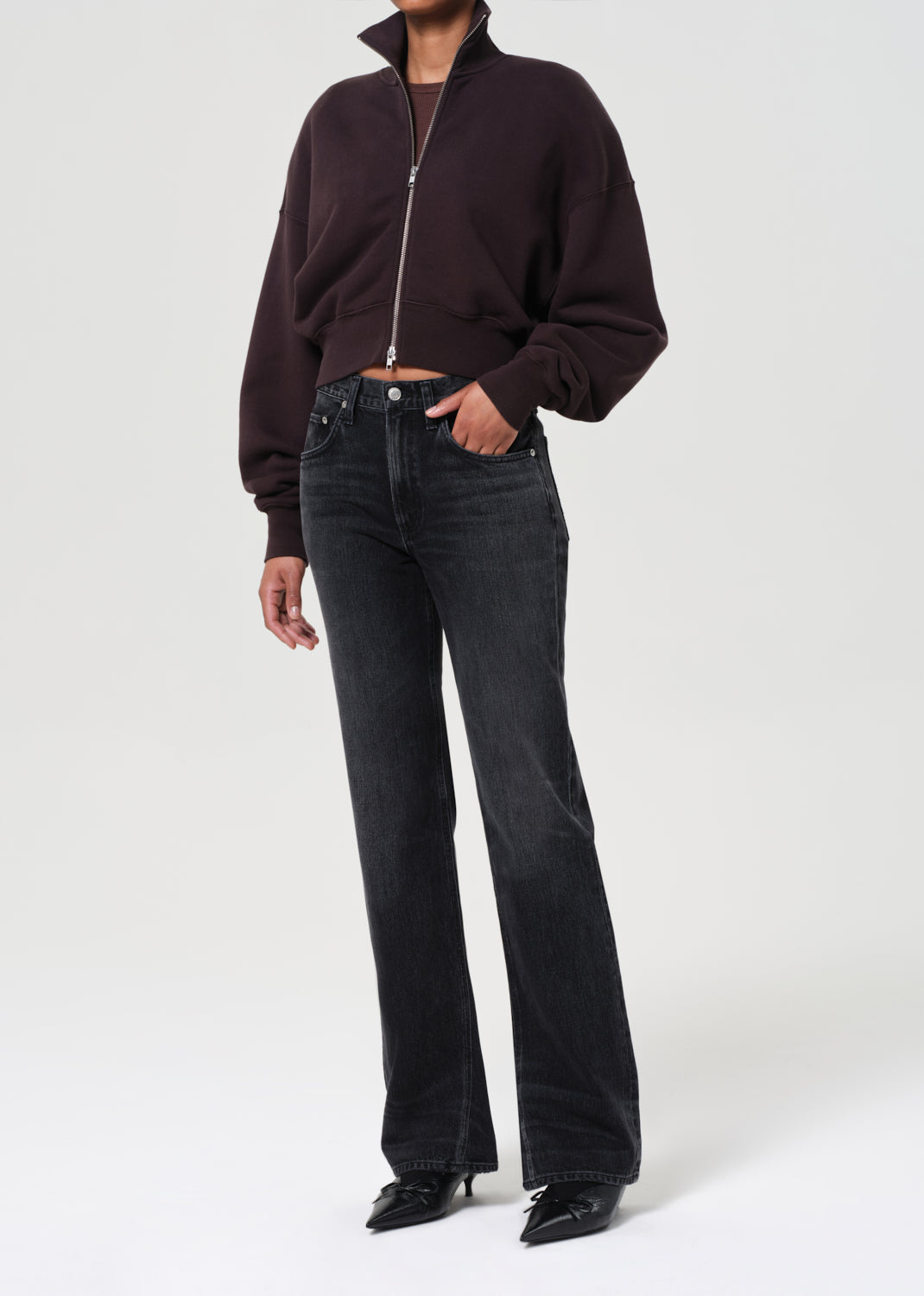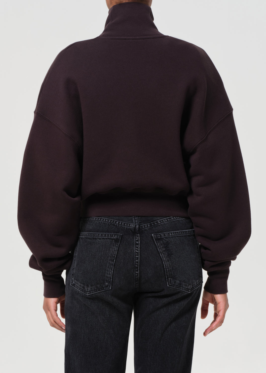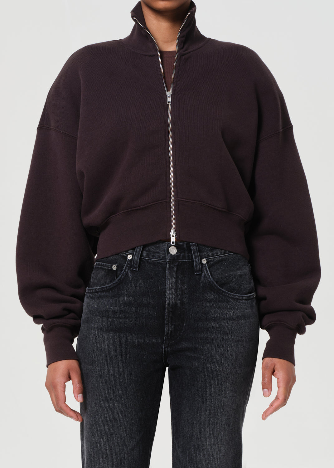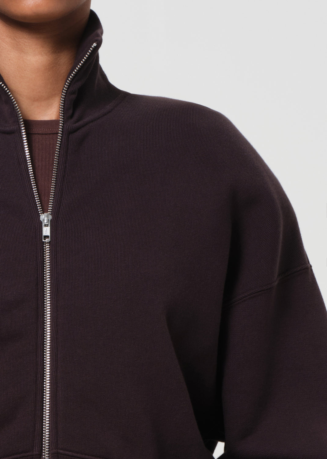 The Darby Zip Up is a high-collared sweatshirt with a cropped, boxy fit and exaggerated ribbed hem. Crafted from breathable, soft cotton fleece with just the right amount of drape, it’s finished in a deep chocolate brown.