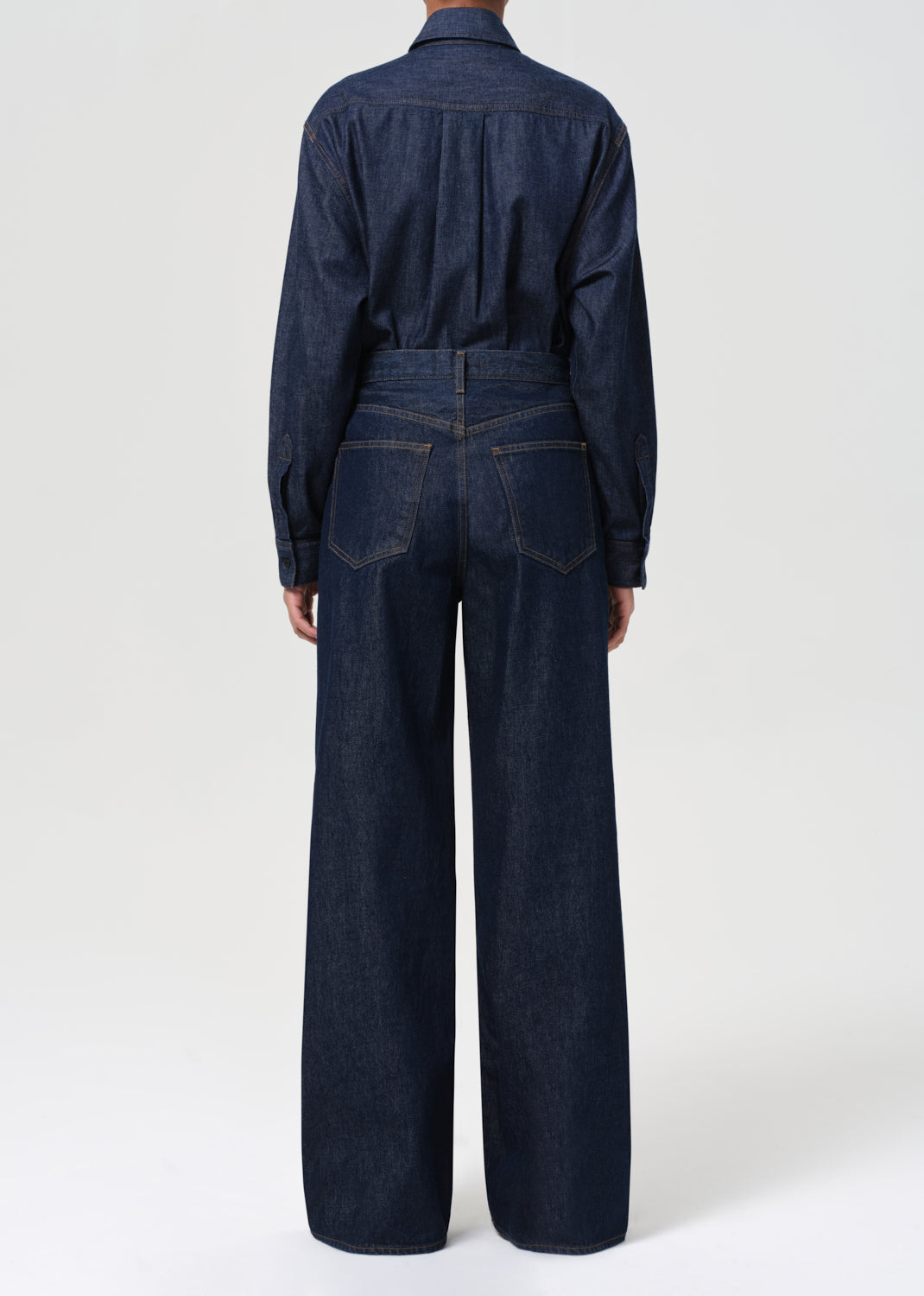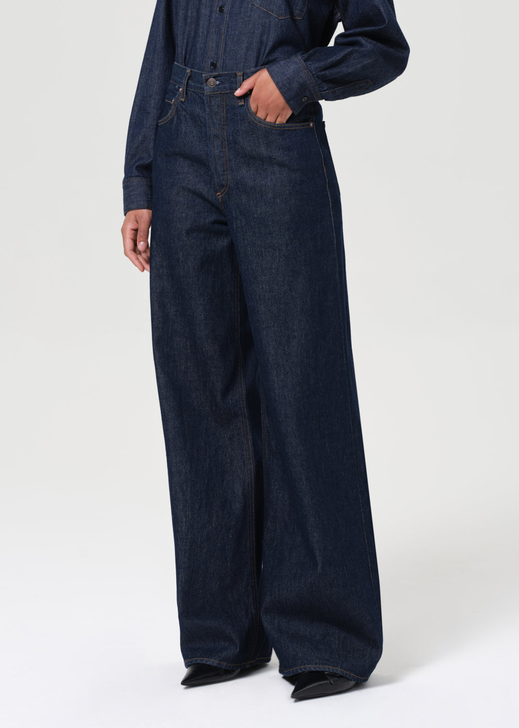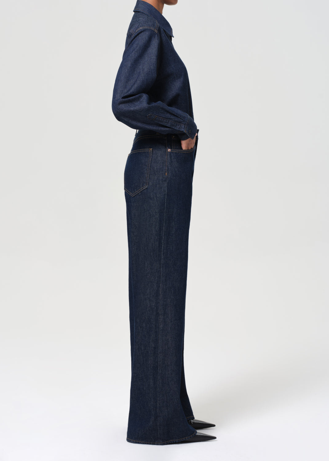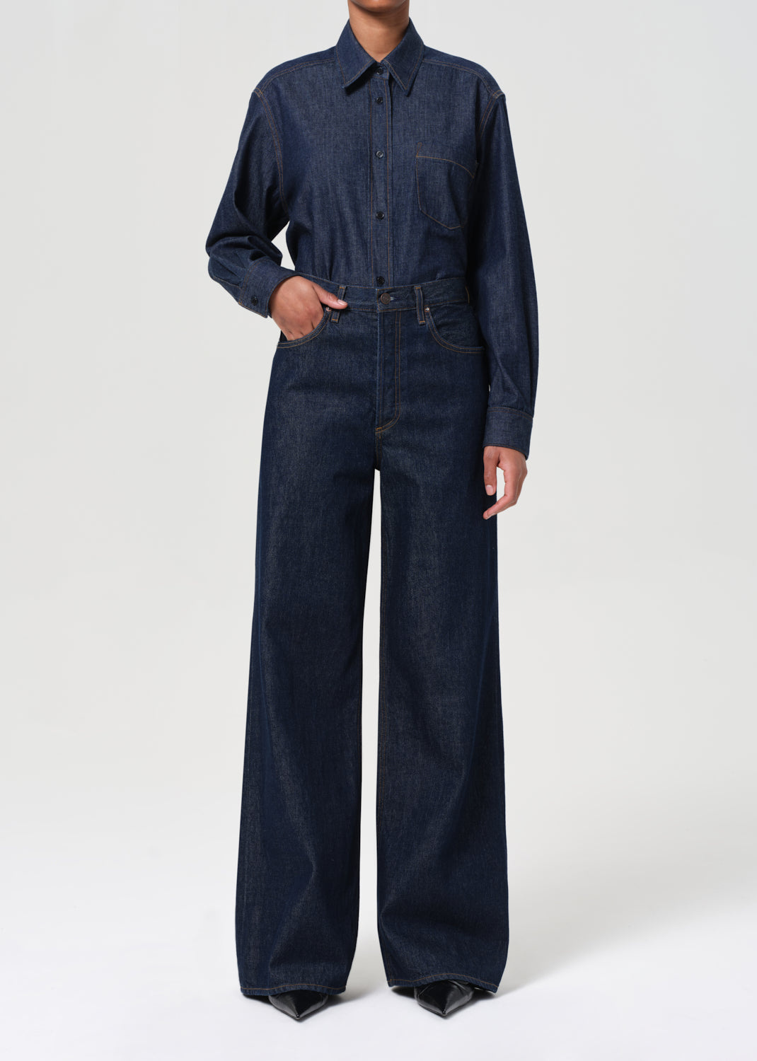 The Dame Jean is a high-rise, full-length silhouette with a wide leg and clean, no-cuff finish. Cut from a rigid cotton blend that combines regenerative and recycled fibers, this dark indigo rinse offers a polished, minimalist look with a soft hand.