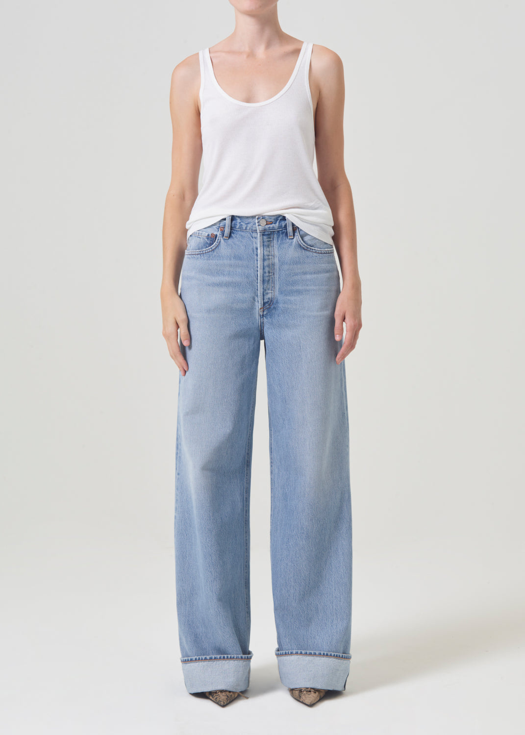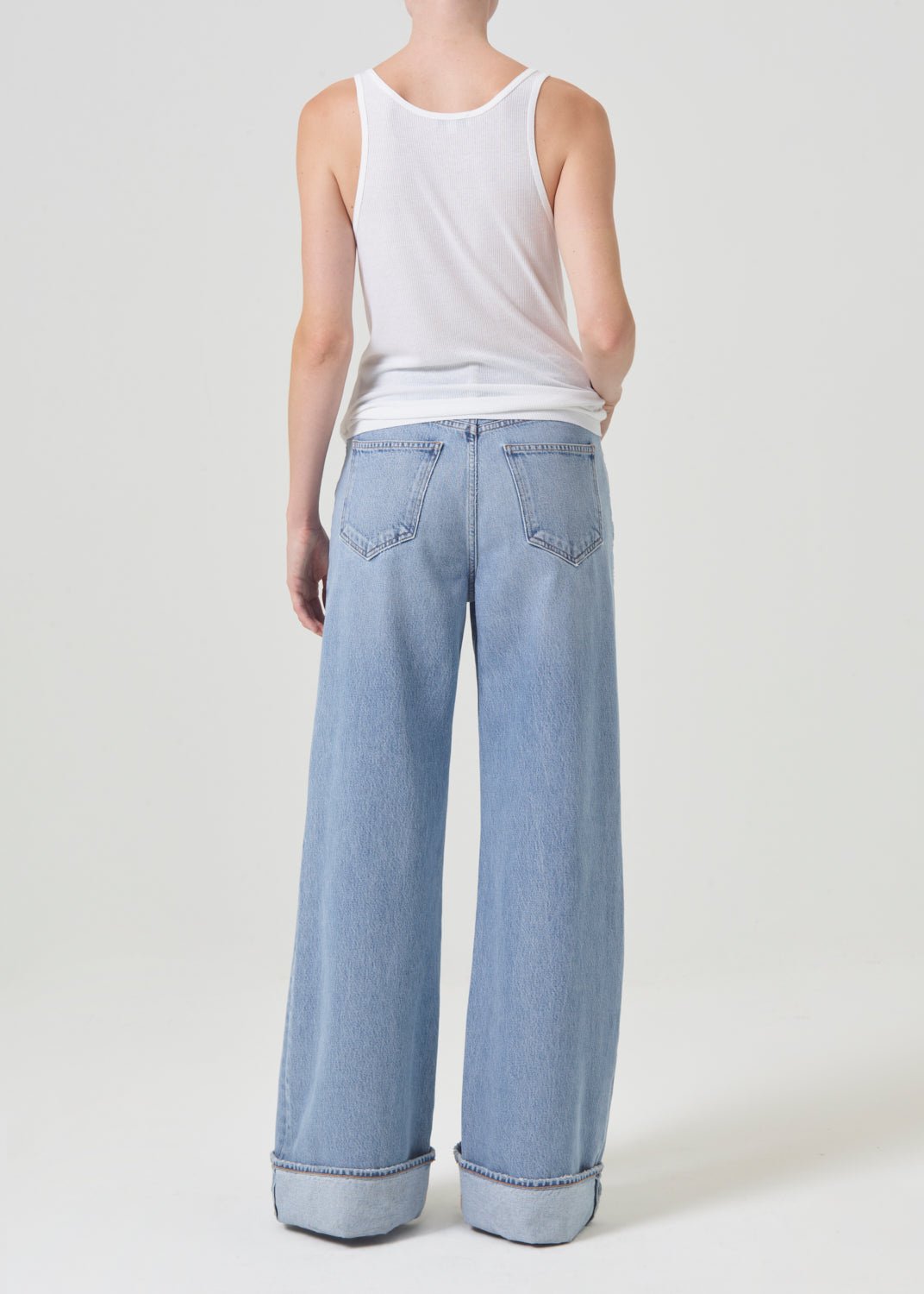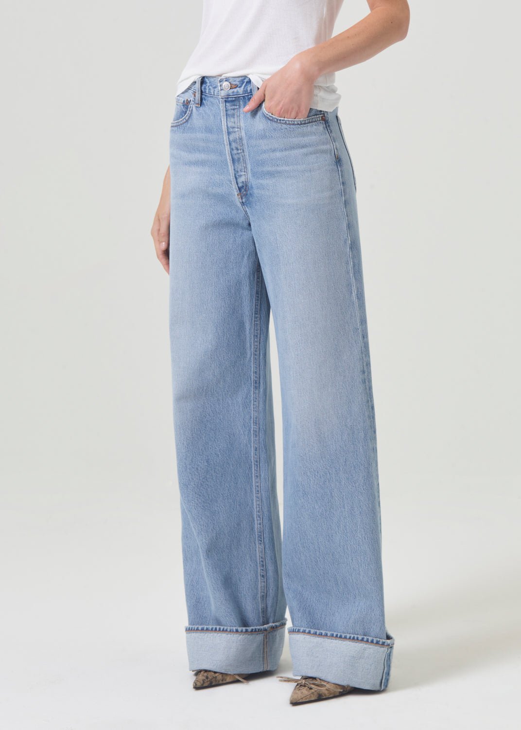 The cuff trend continues with AGOLDE's Dame Jean. Featuring a waist-accentuating high-rise, a relaxed, wide leg, and an untacked cuff. Create an ultra-flattering look by styling the statement fit back to a sleek tee.