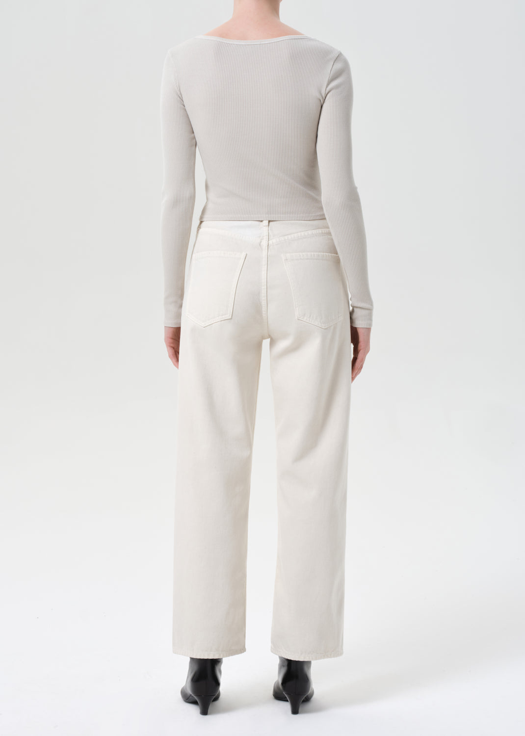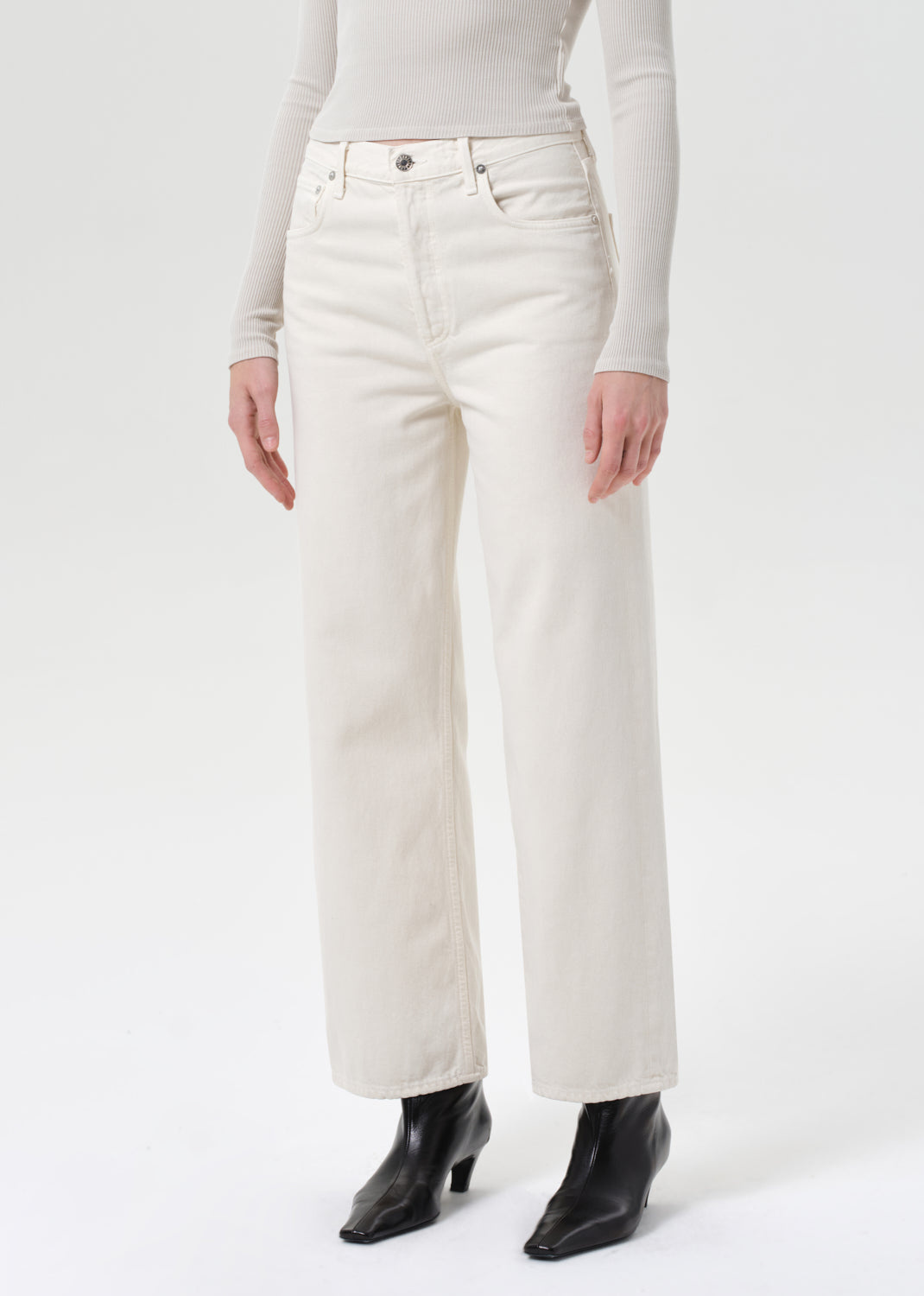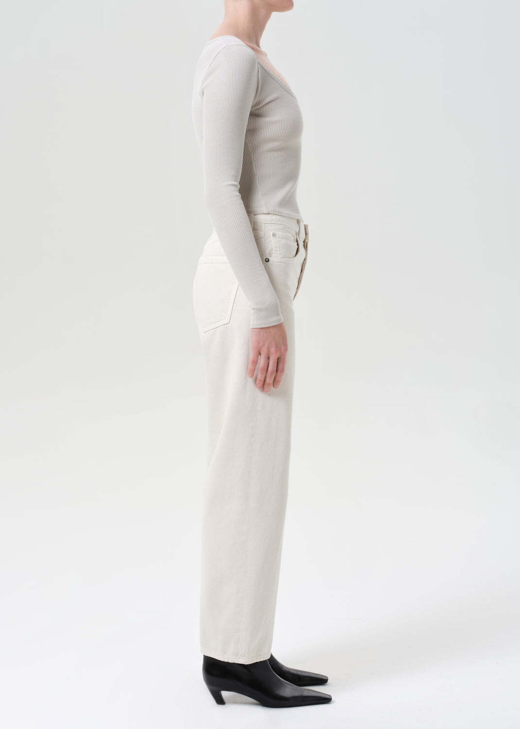 AGOLDE’s Ren Jean offers a clean, elevated take on the classic wide-leg silhouette. Crafted from 100% rigid, non-stretch regenerative cotton, these high-rise jeans feature a warm, light beige tone.