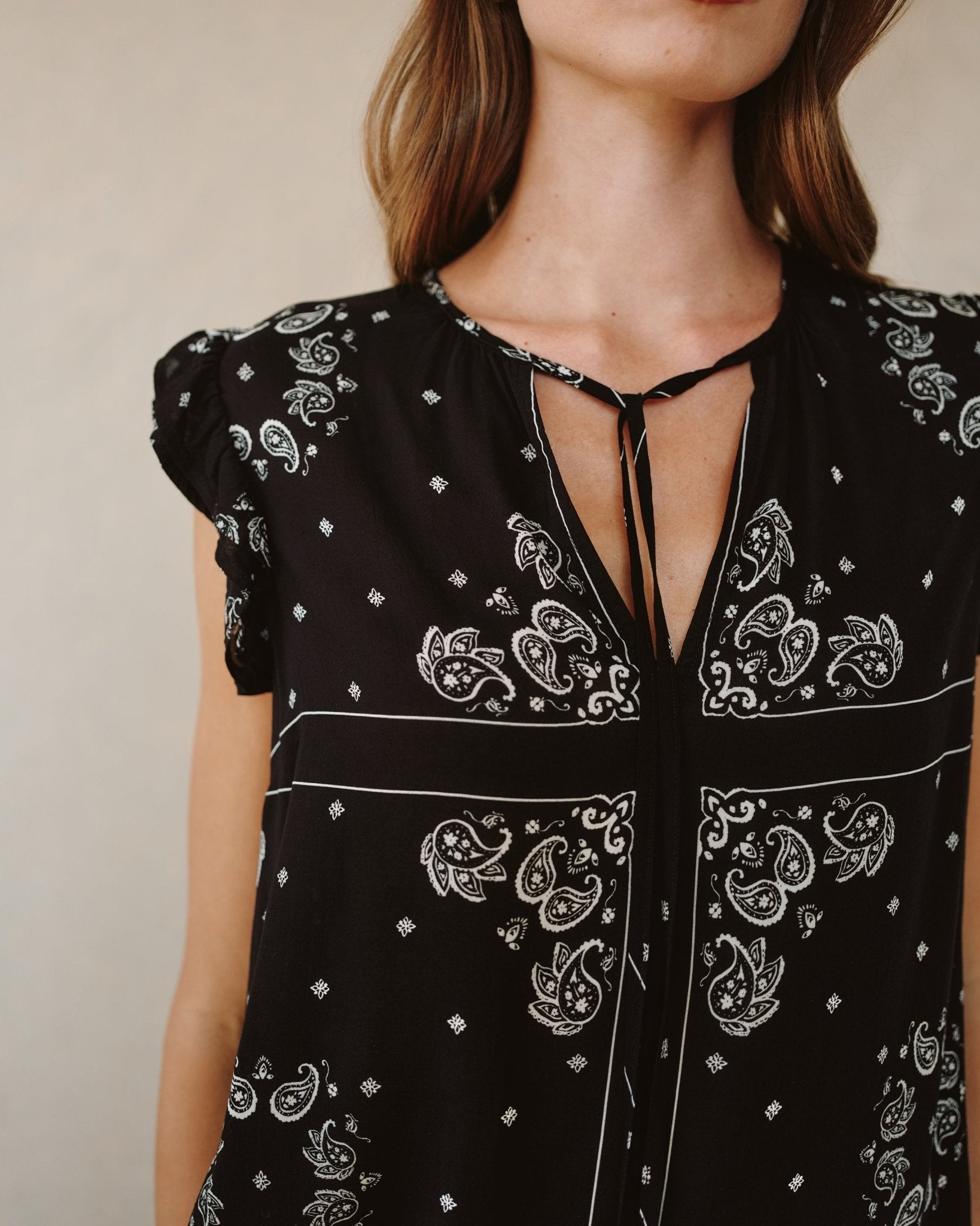 Airy and detailed, the Ruffle Sleeve Tie Neck Top is an elevated style designed for late summer into early fall.