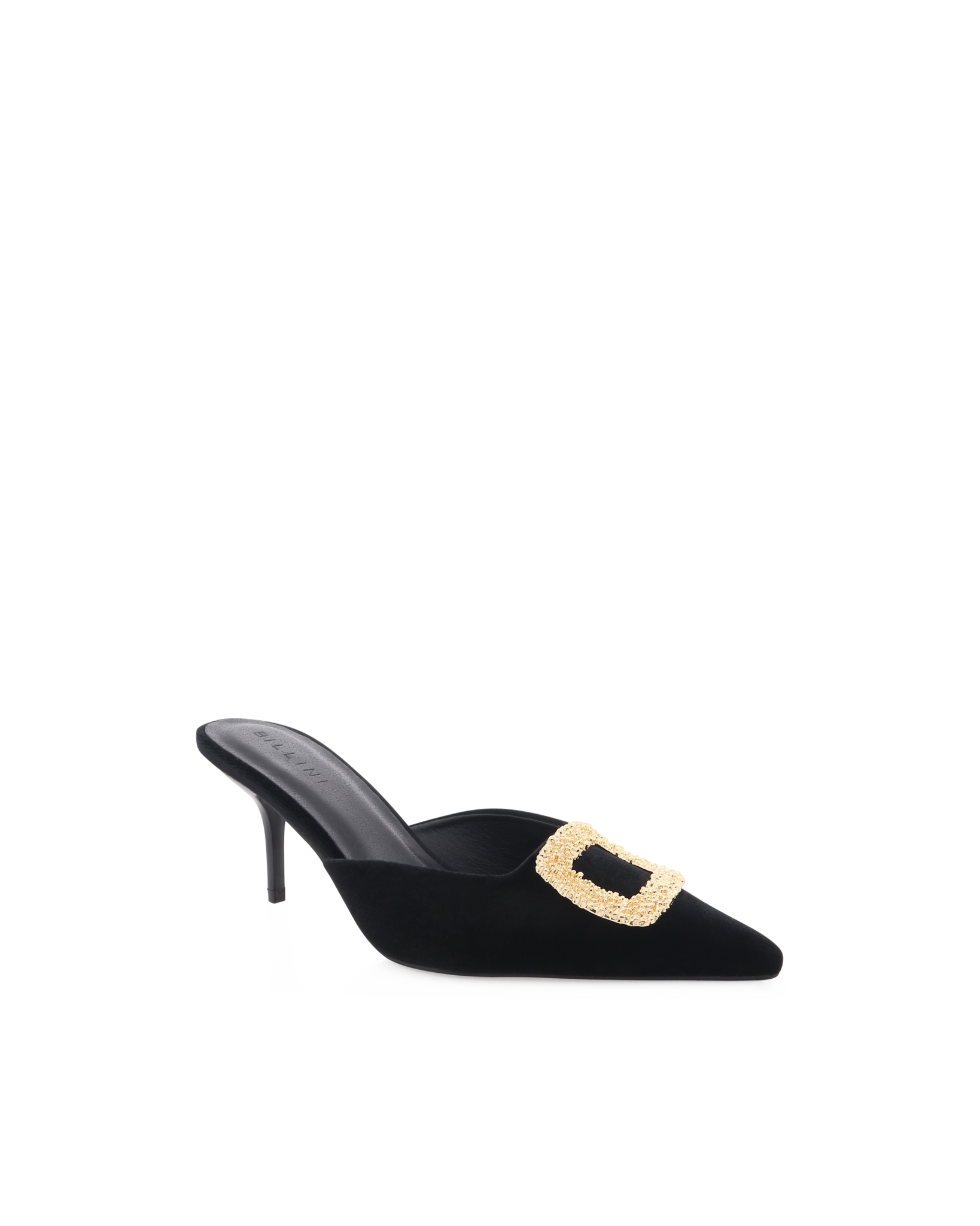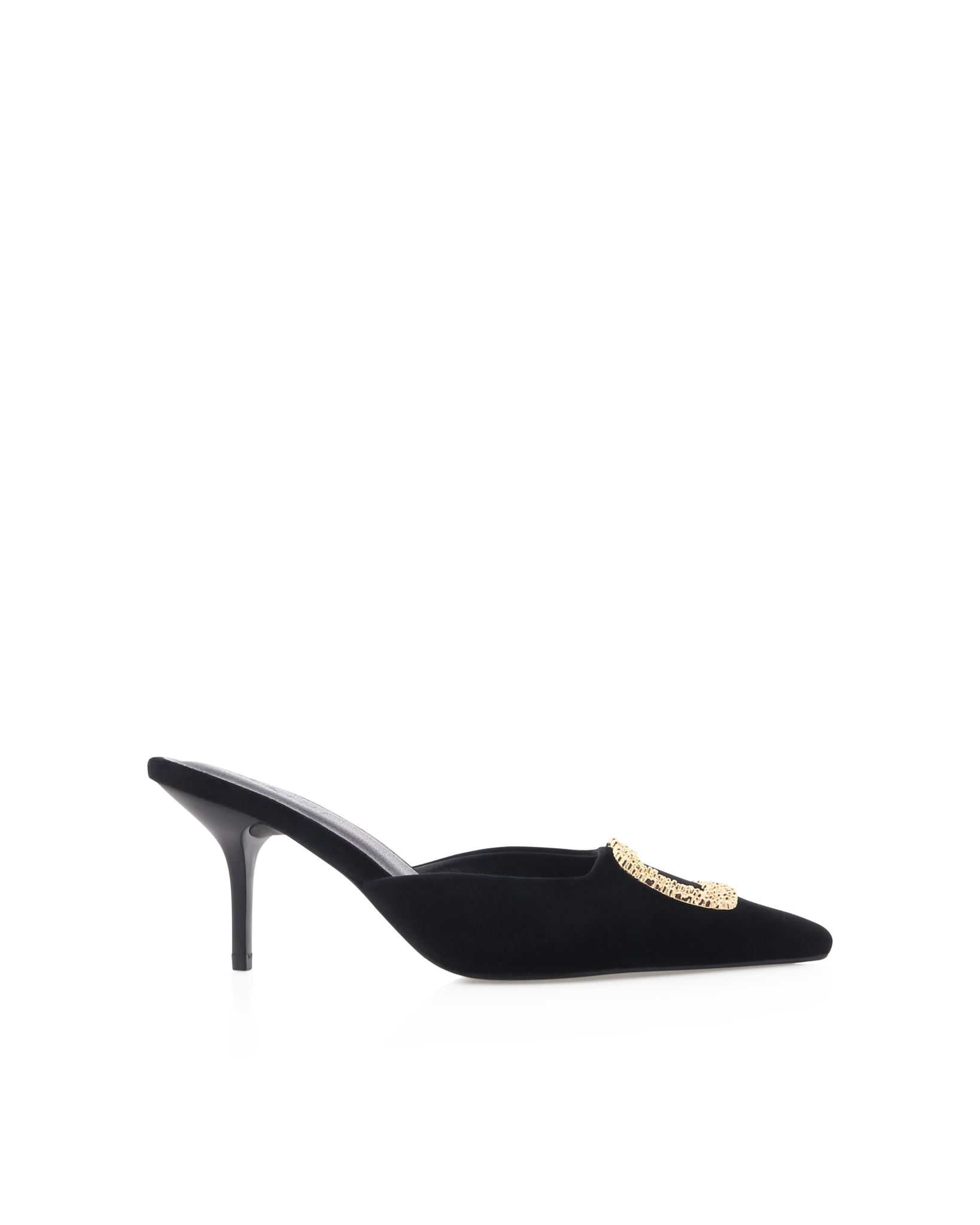 A holiday staple, the Lowell heel provides a mule heel design with an embellished toe detail.