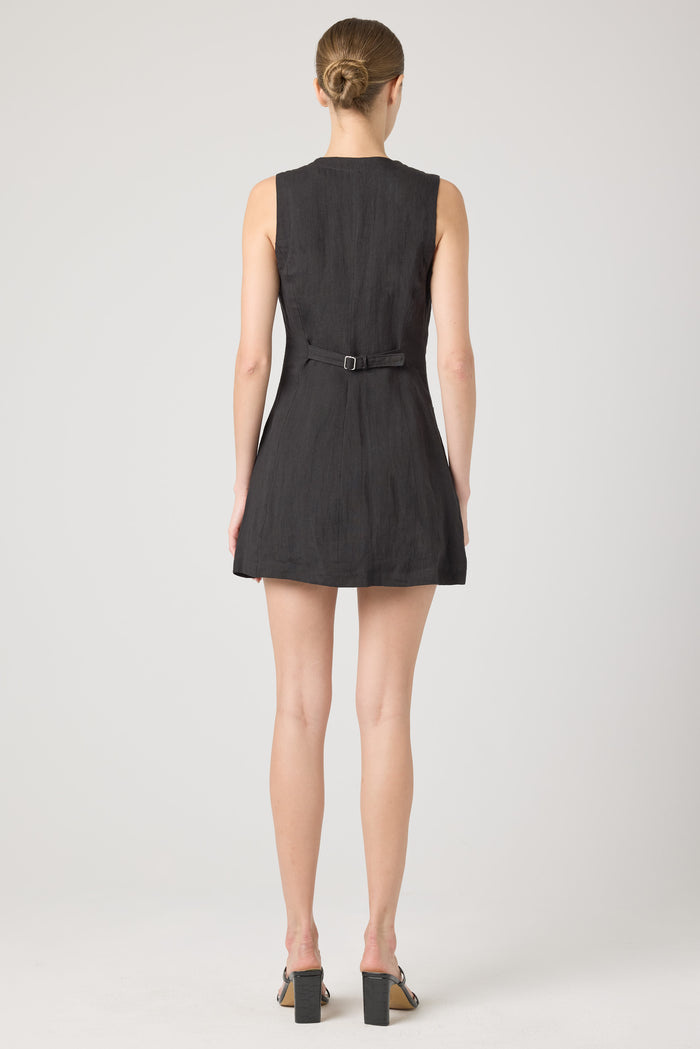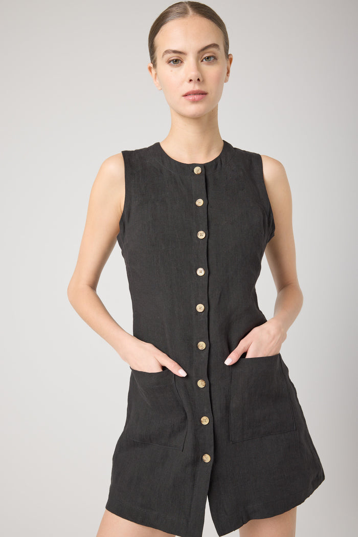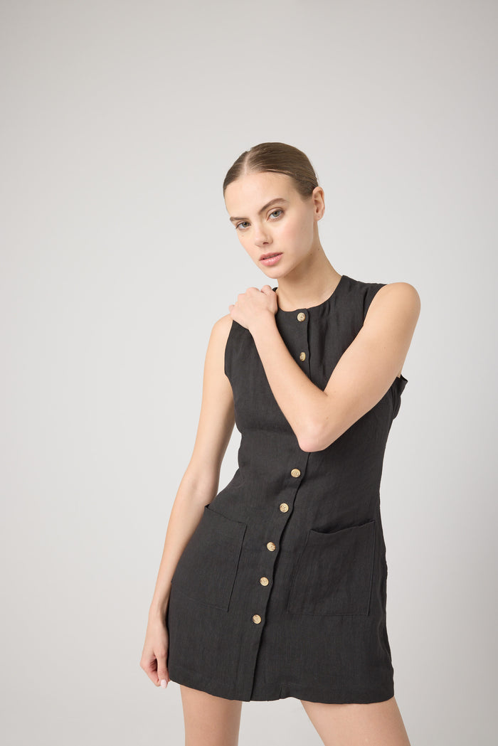 A black linen mini dress with contrast buttons that will go from desk to drinks with ease.