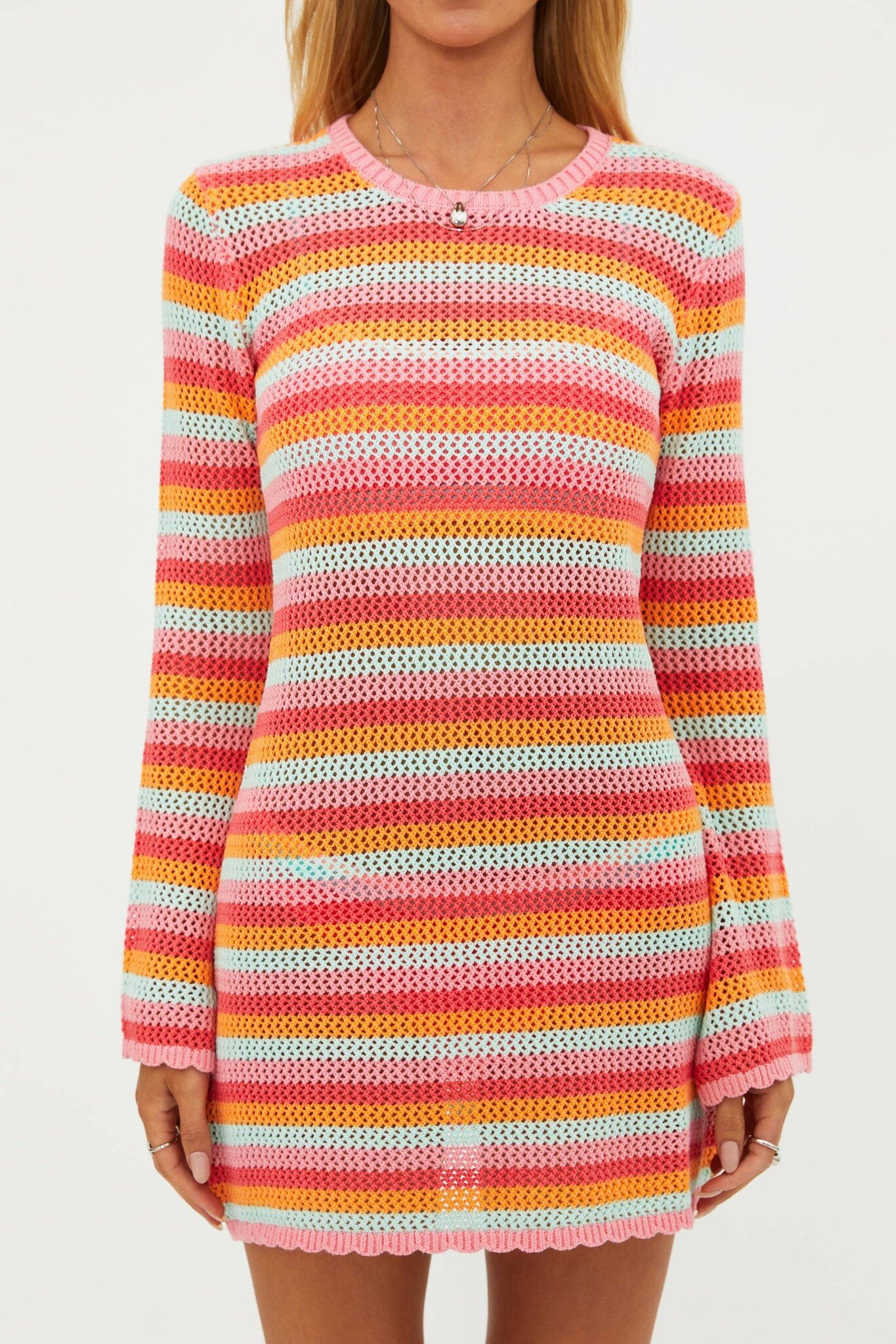A mini length crochet coverup dress in a multicolor stripe pattern, featuring long sleeves with slight flare.