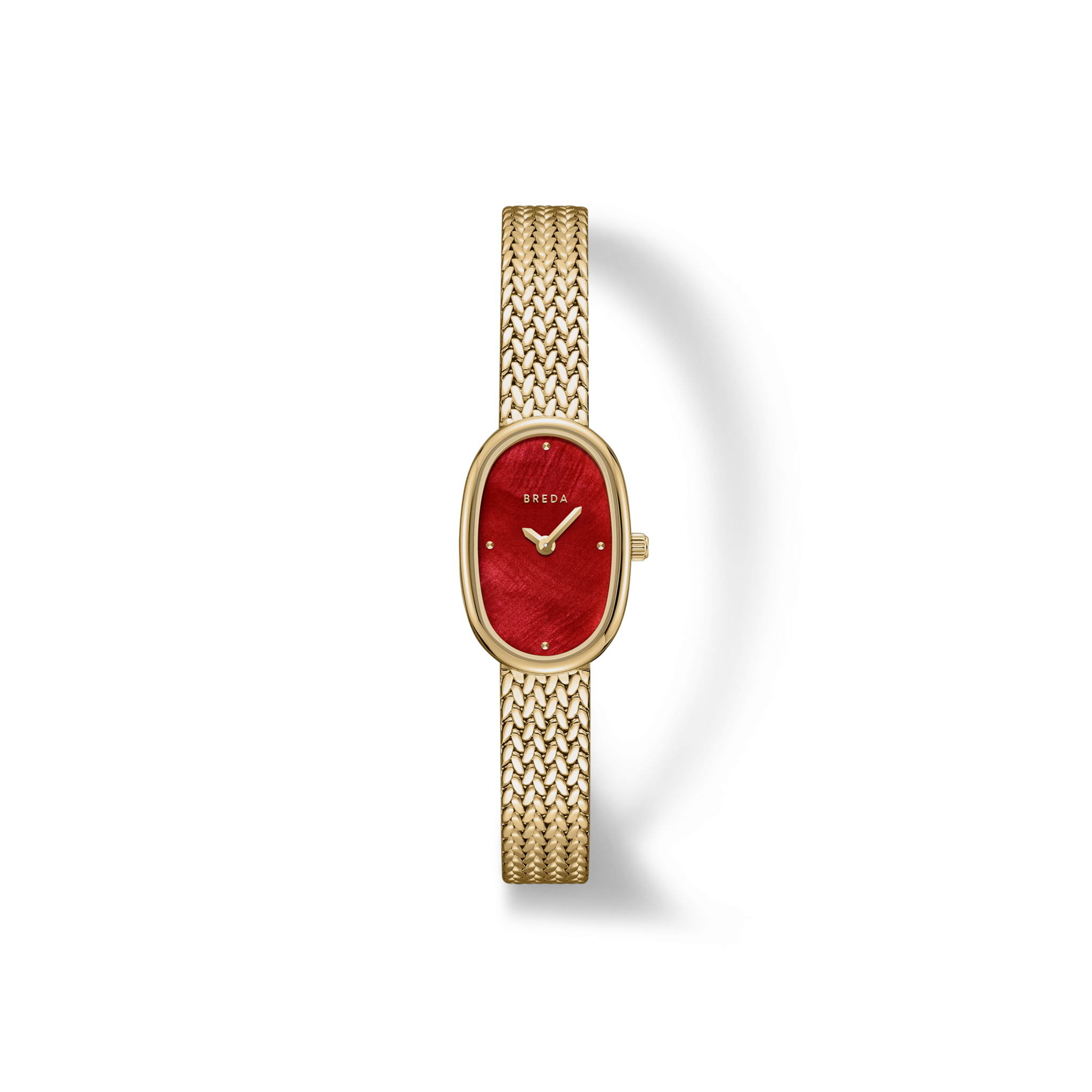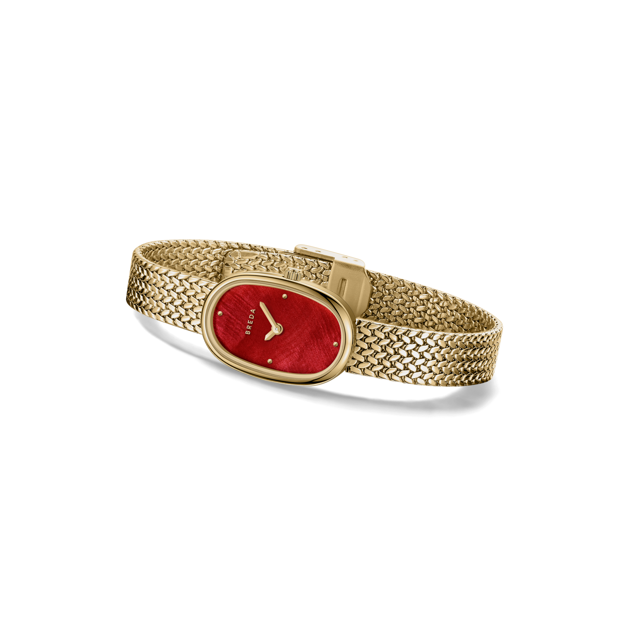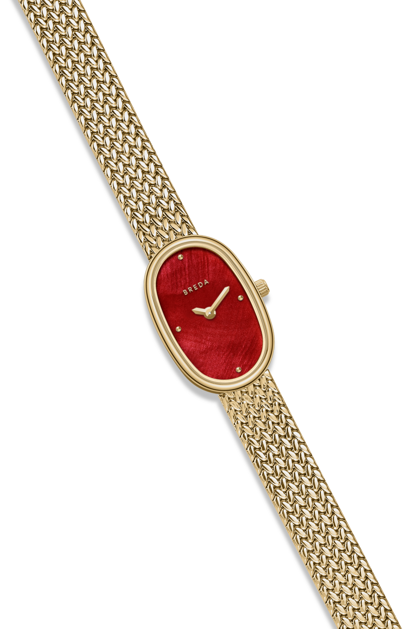 The Jane Mini Tethered watch features a more compact 18mm oval case and is complemented by a red mother of pearl dial with a woven mesh bracelet that fastens with a quick release clasp.