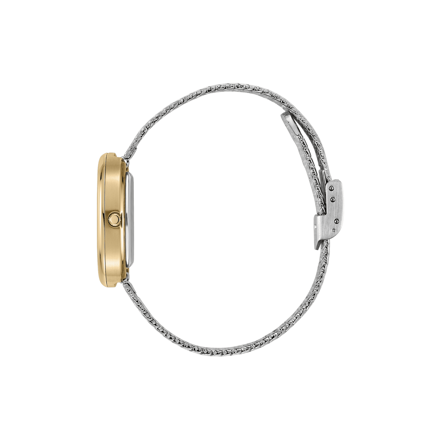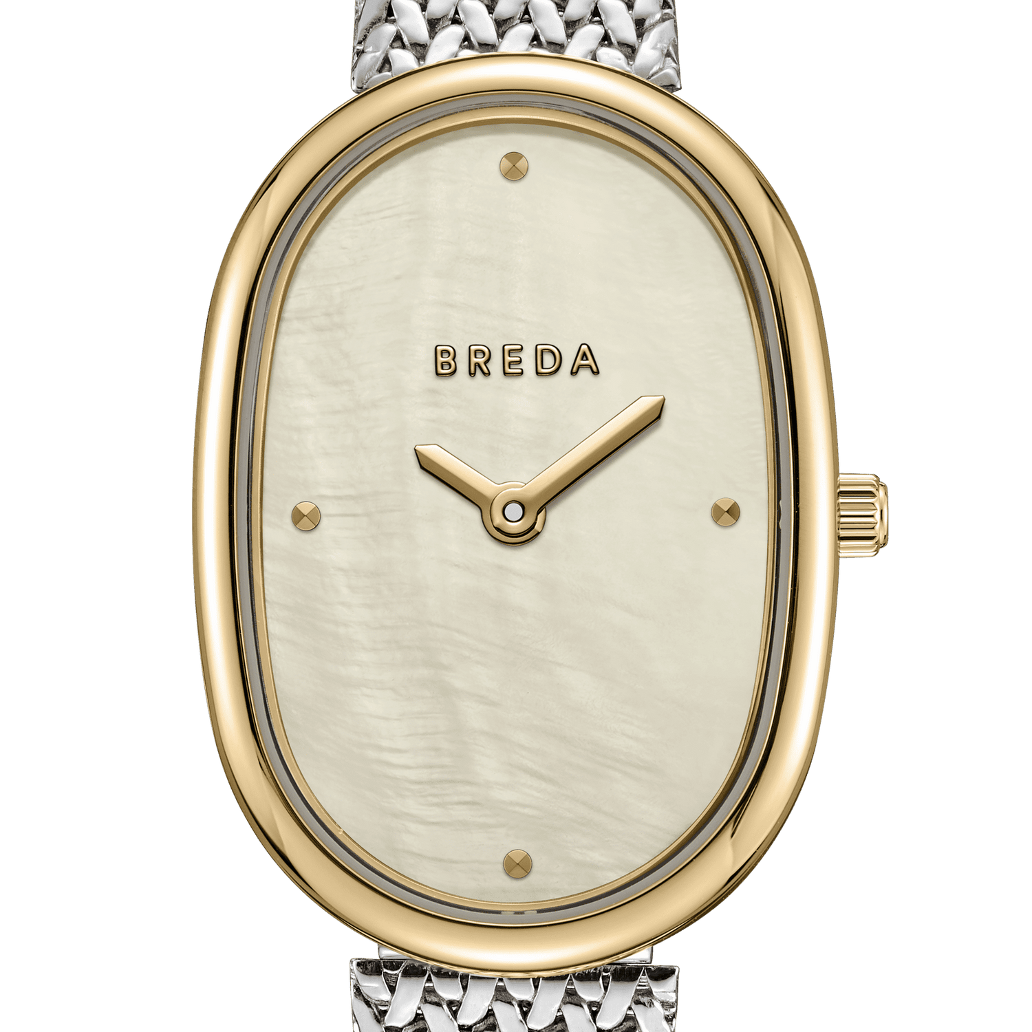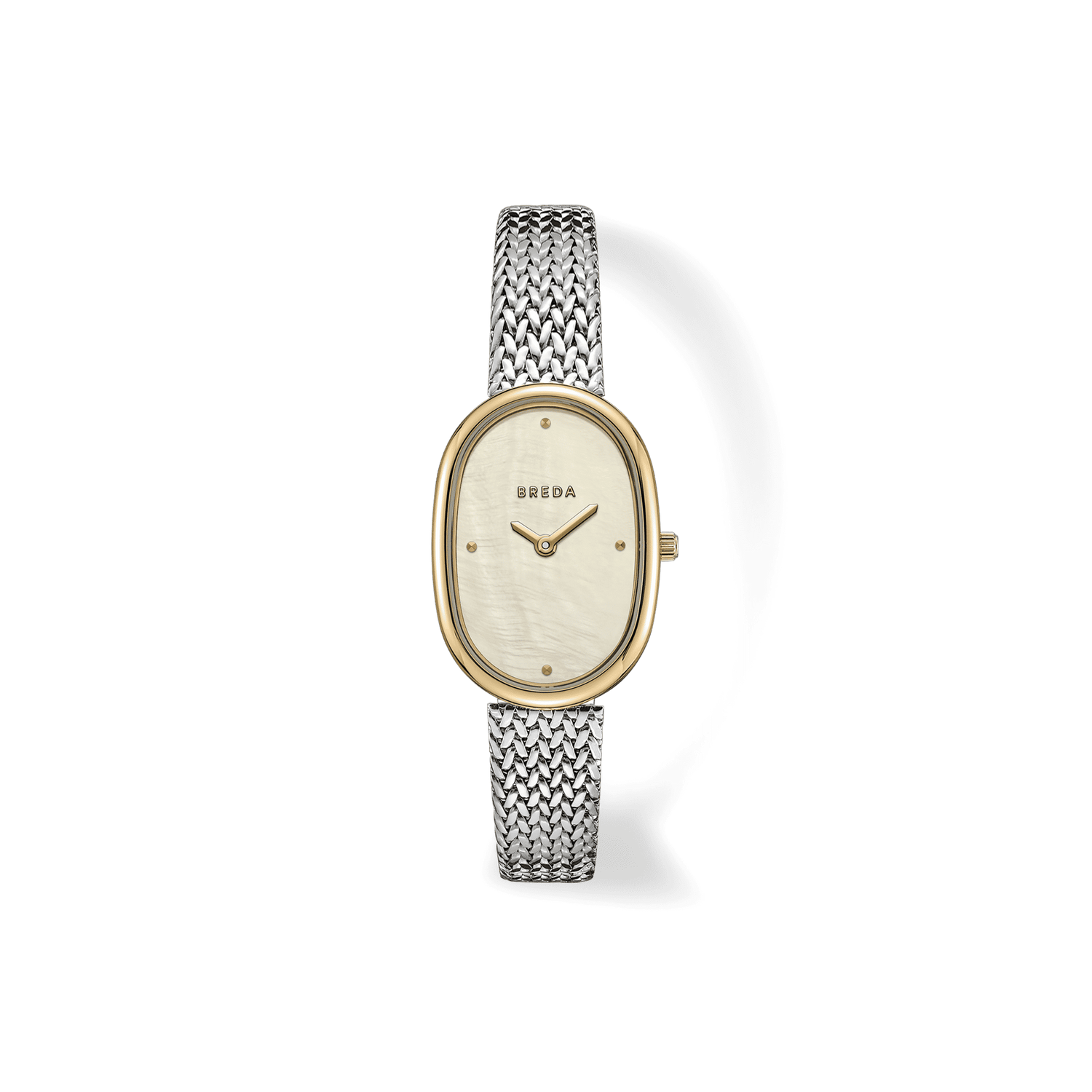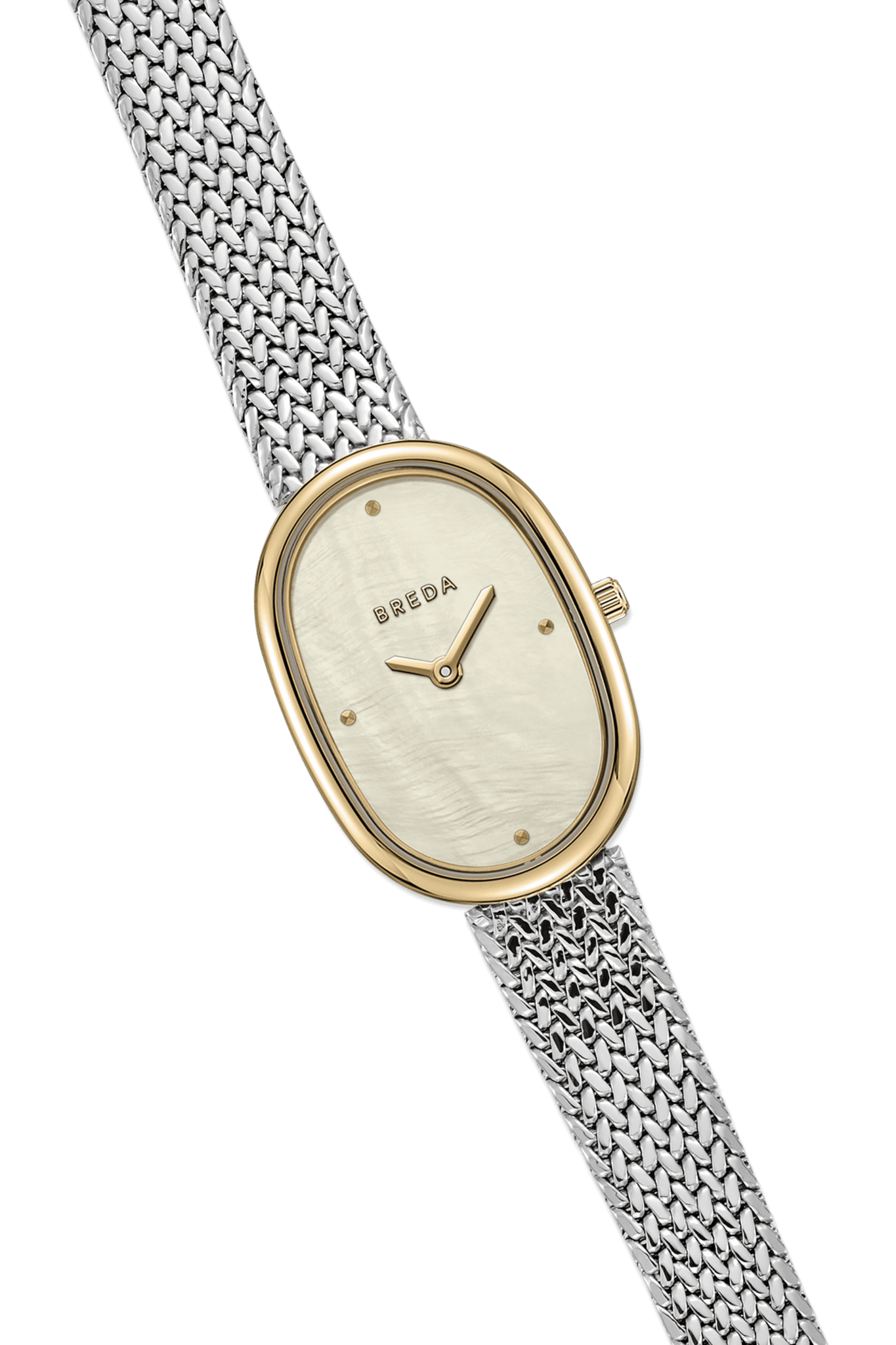 The Jane (Tethered) watch carries a delicate 23mm oval case, champagne mother of pearl dial and a tapered woven mesh bracelet that fastens with a quick release clasp.