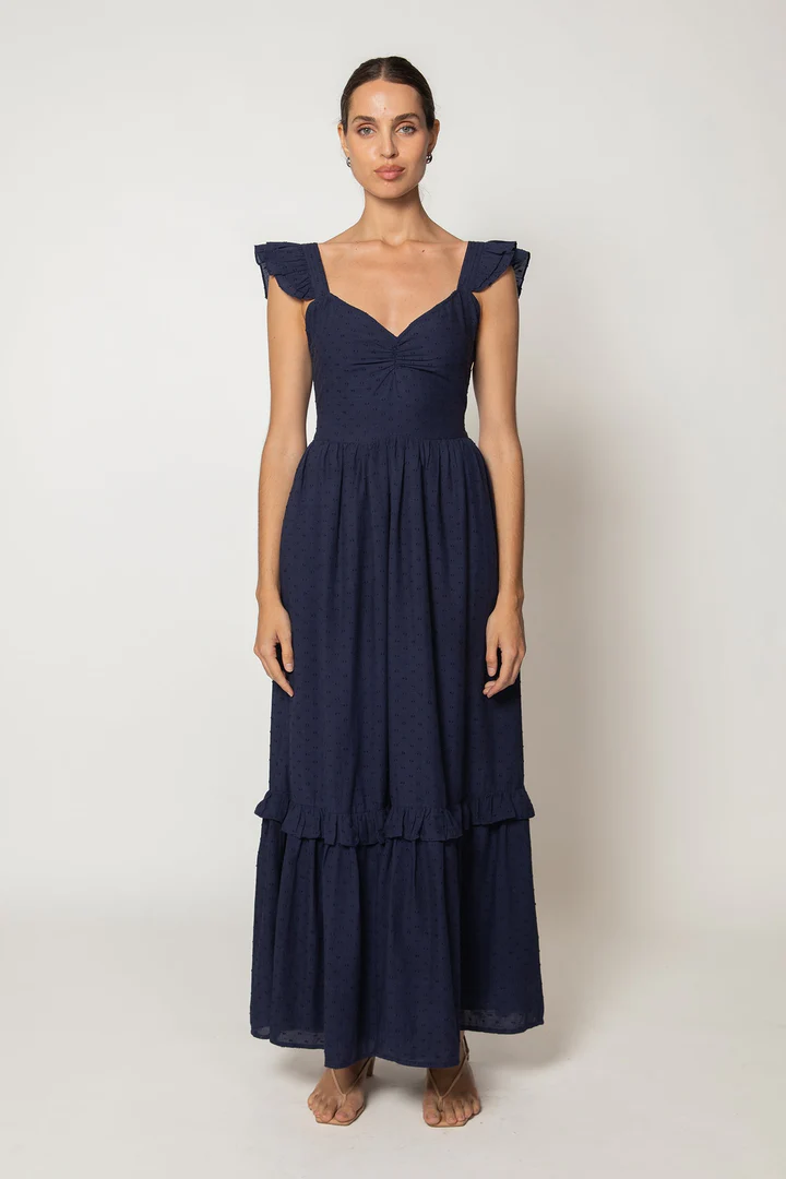 In organic cotton, the Nica Maxi Dress features an elegant sweetheart neckline, fit with a cinched detail at the center front. In a soft organic dobby fabric, this dress is the epitome of style and comfort.