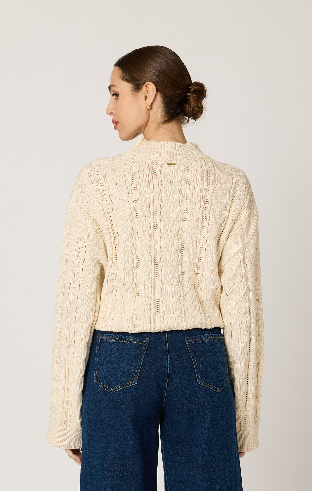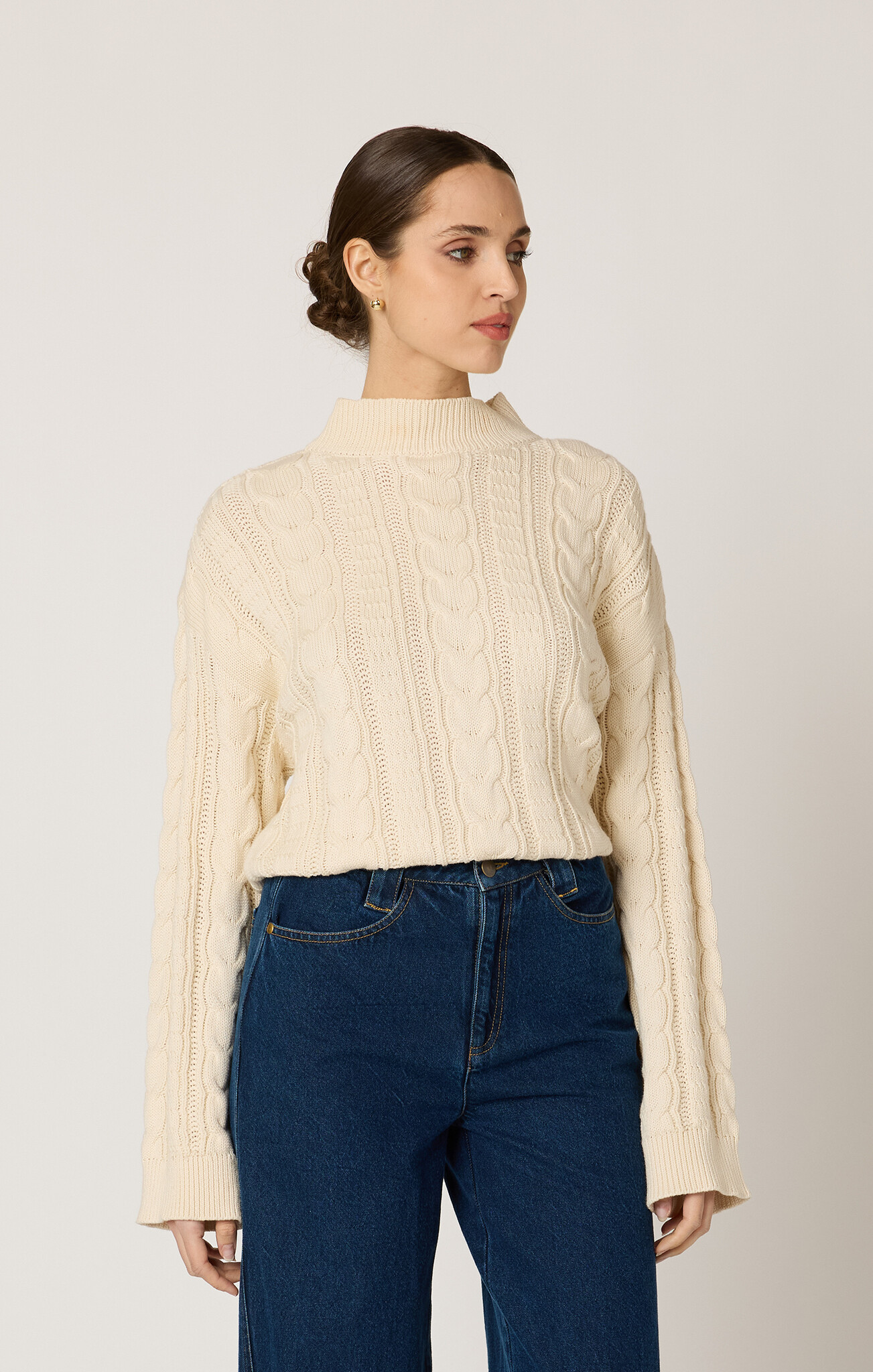 The Janie Sweater crafted from 100% certified organic cotton yarn, offering sustainable comfort and timeless style. This lightweight turtleneck features cable knit stitching, making it perfect for layering or wearing on its own.