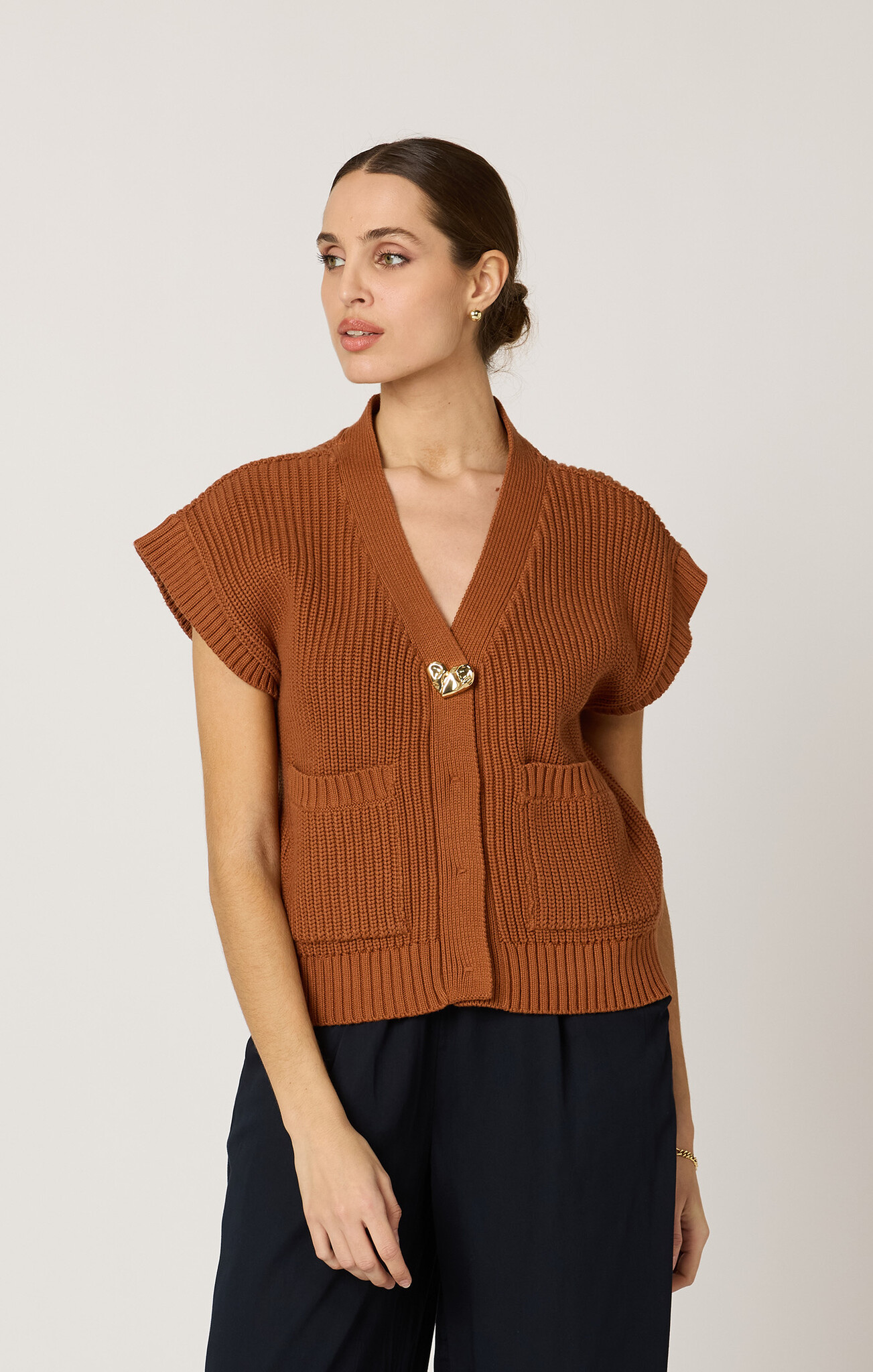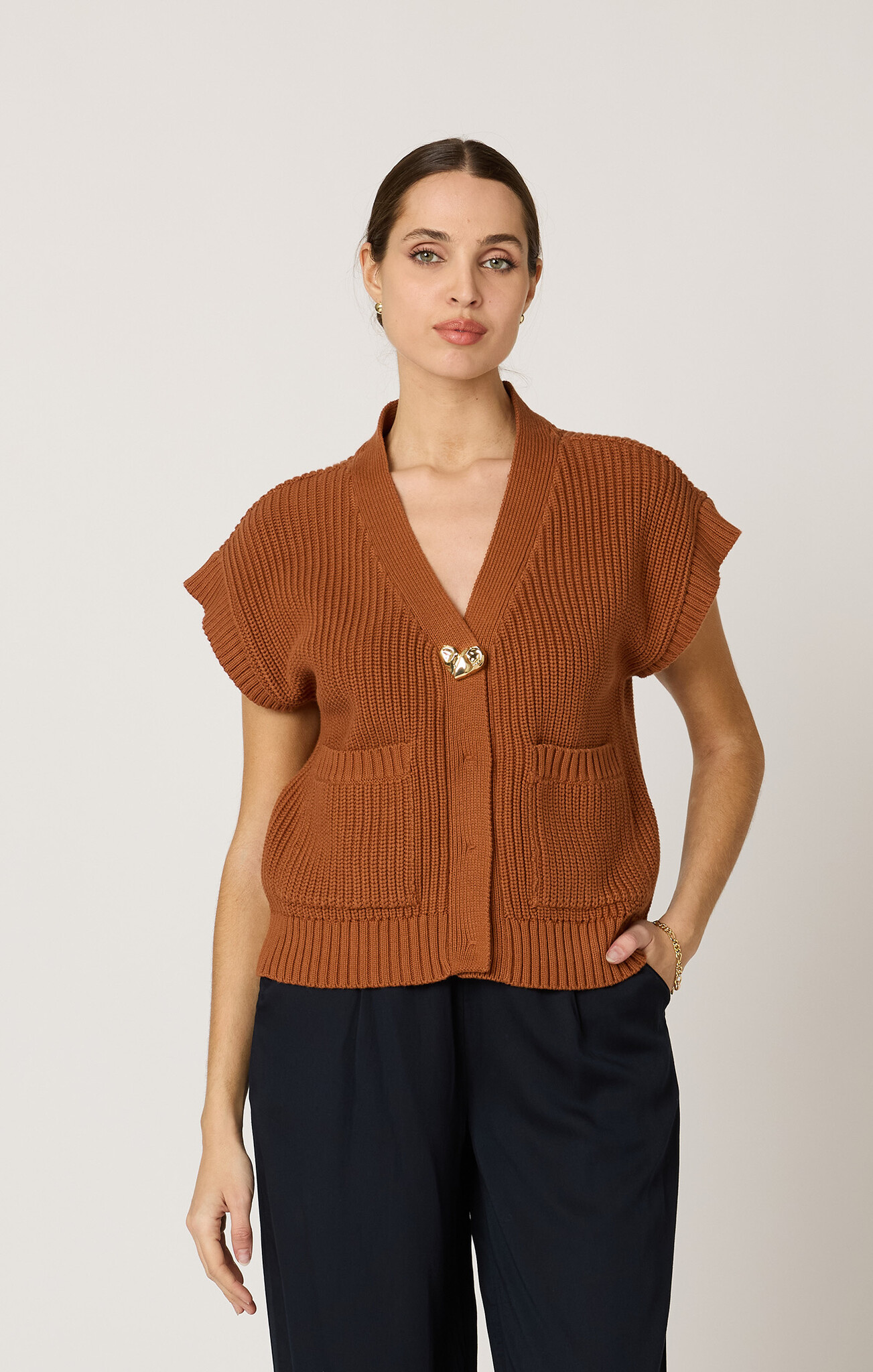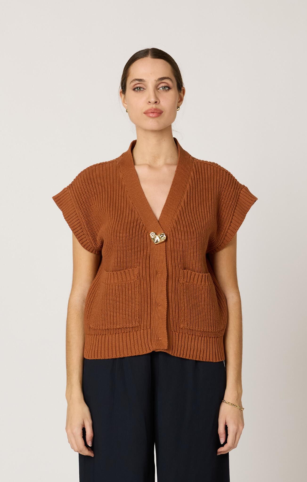The Cuore Sweater Vest is a timeless layering piece designed for effortless sophistication. This sustainable knit vest features a relaxed drop-sleeve silhouette, functional pockets, and a gold heart button accent.