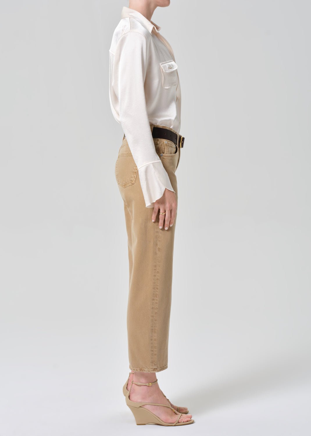 A modern nod to boyish vintage denim, the Faye sits low on the hip with a contoured inseam that shapes and flatters. Cut from rigid, beige denim, this cropped silhouette balances relaxed ease with refined structure.