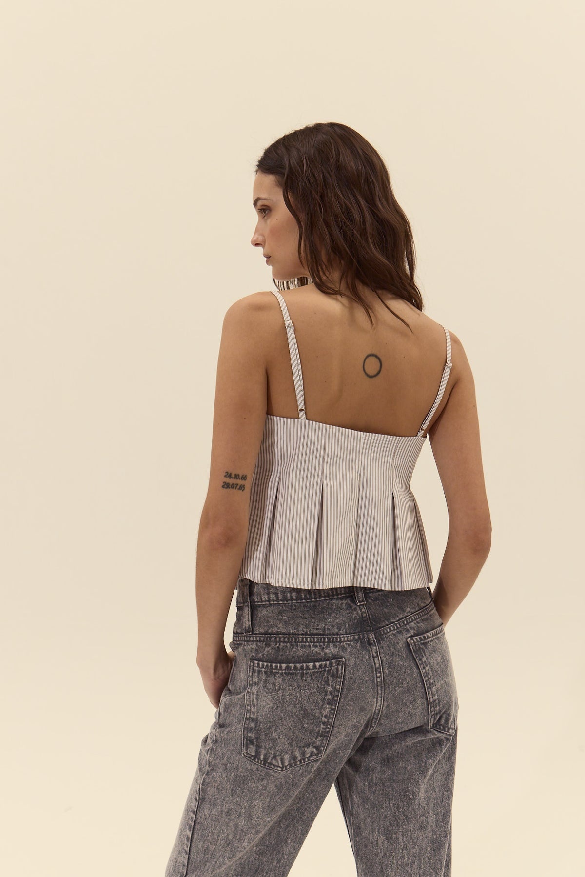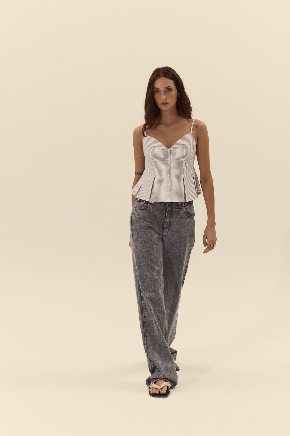 The Corvo Top is designed with a fitted bodice featuring corset-inspired bust seaming, a front button closure, and pleats at the waist on both the front and back for added shape.