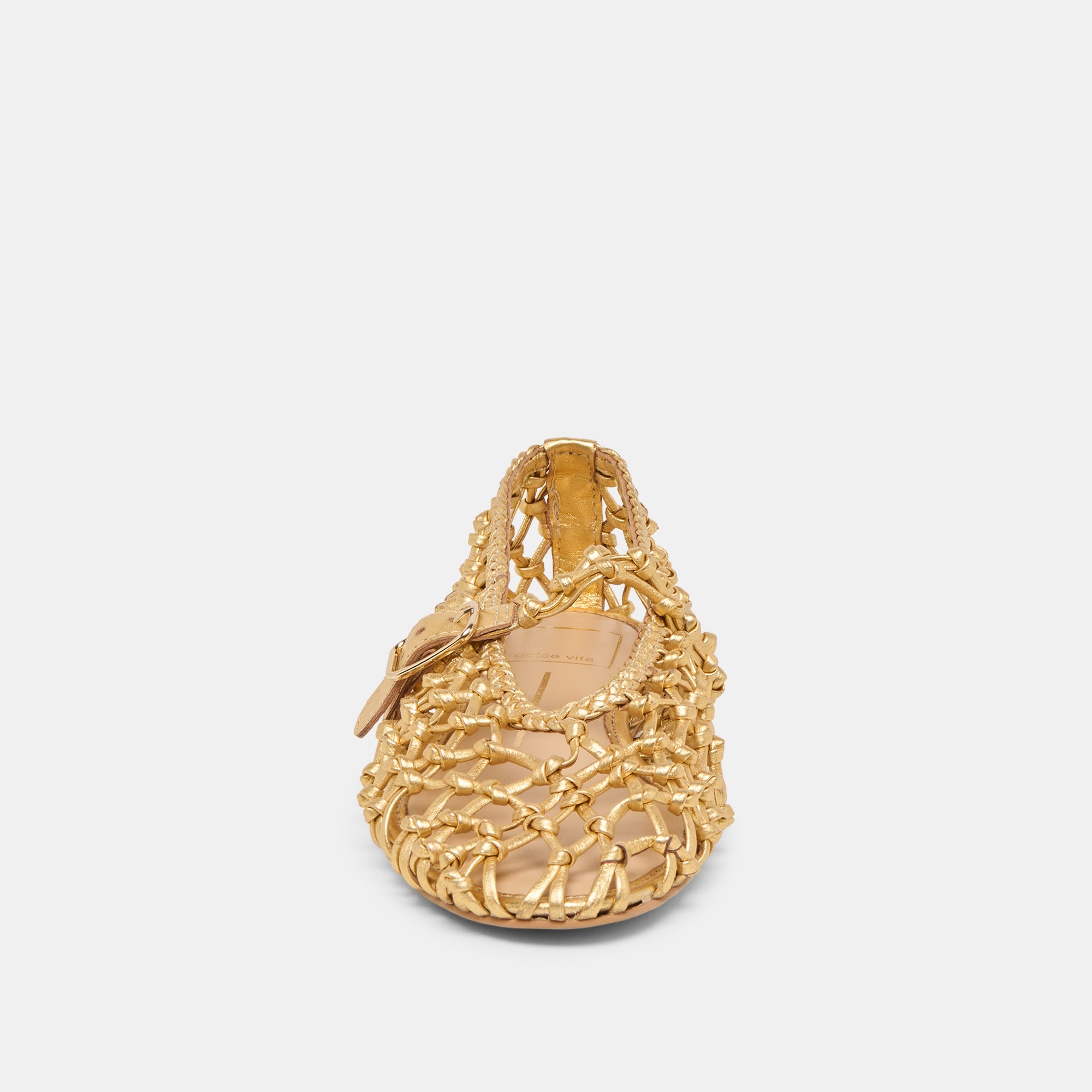Clair delivers an edgier take on the see-through ballet flat trend. Her woven, knotted leather design is giving the mary jane touch with a gold buckled strap. She is bold enough to make a statement yet comfy and versatile enough for everyday wear.