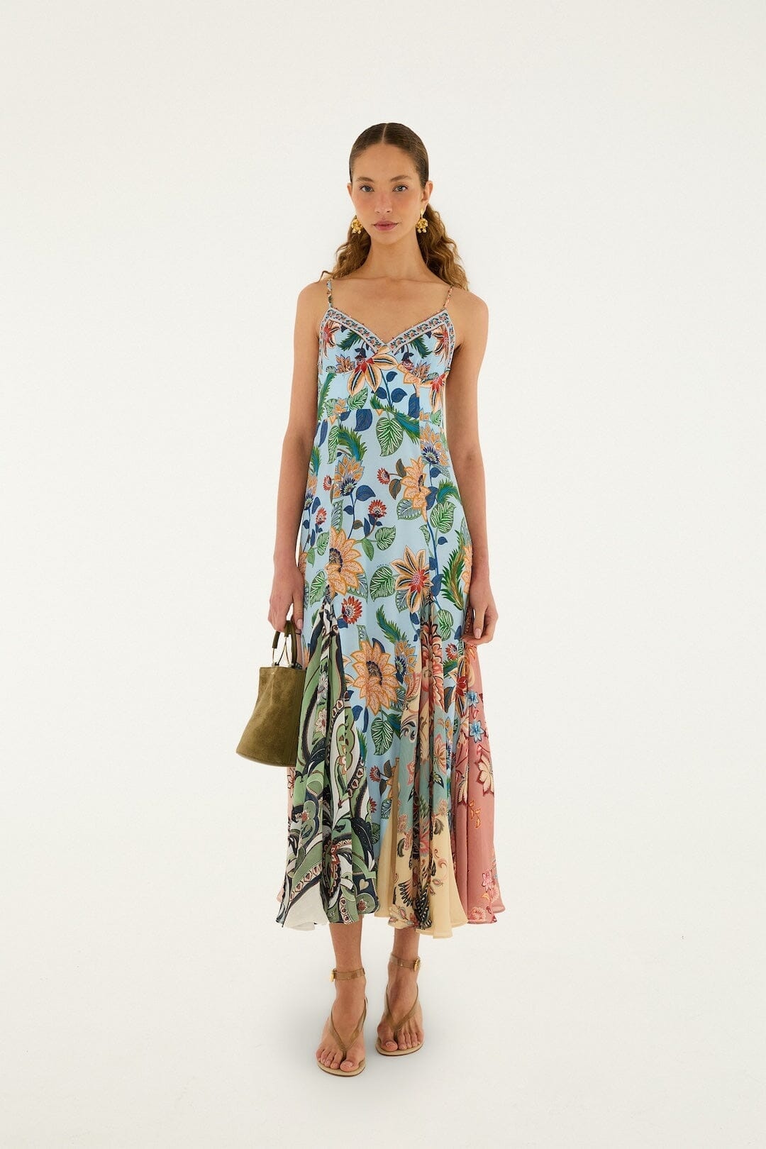 Embrace effortless summer charm with the Floral Delhi Maxi Dress. Its sweet blue hue blossoms with vibrant floral patterns, creating a joyful, sun-kissed vibe. The flattering sweetheart neckline gracefully frames the decolletage.