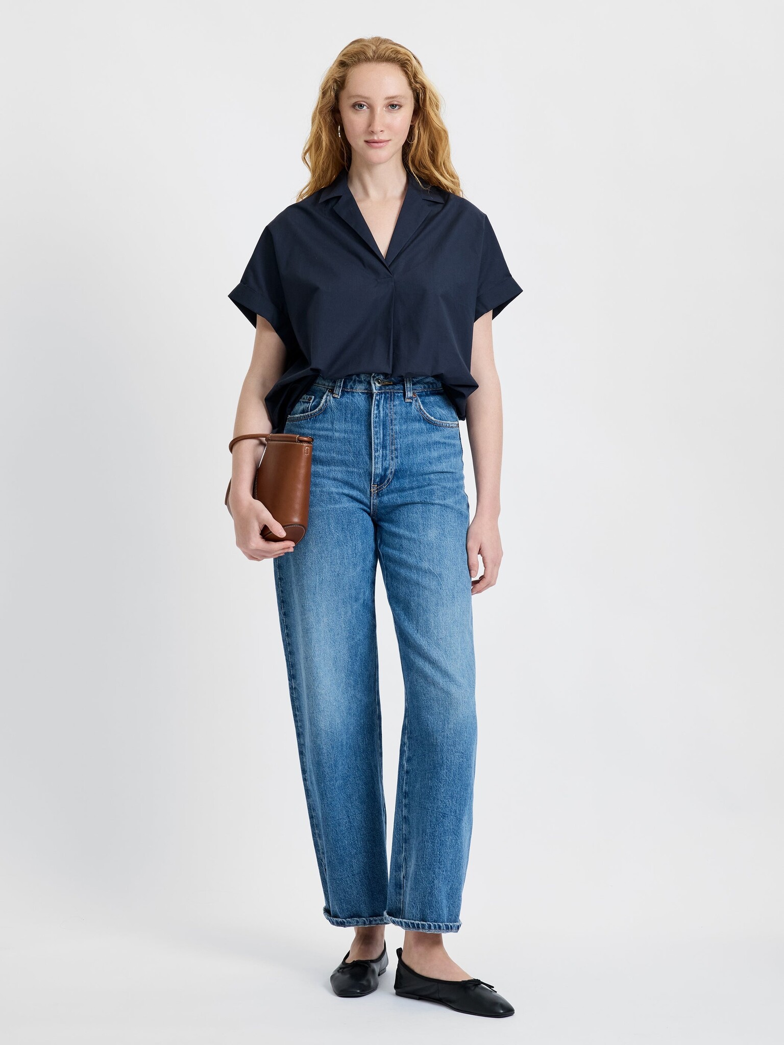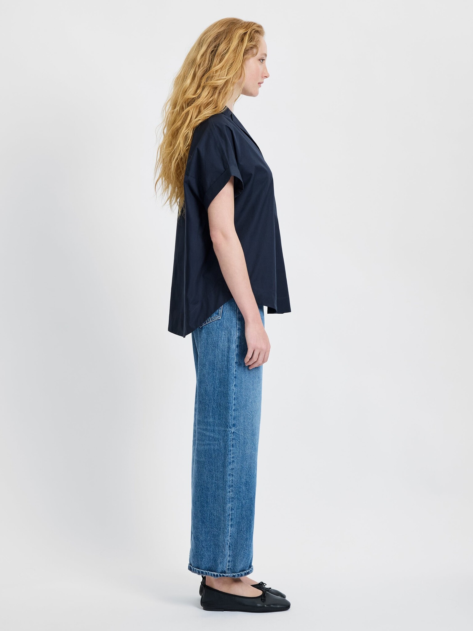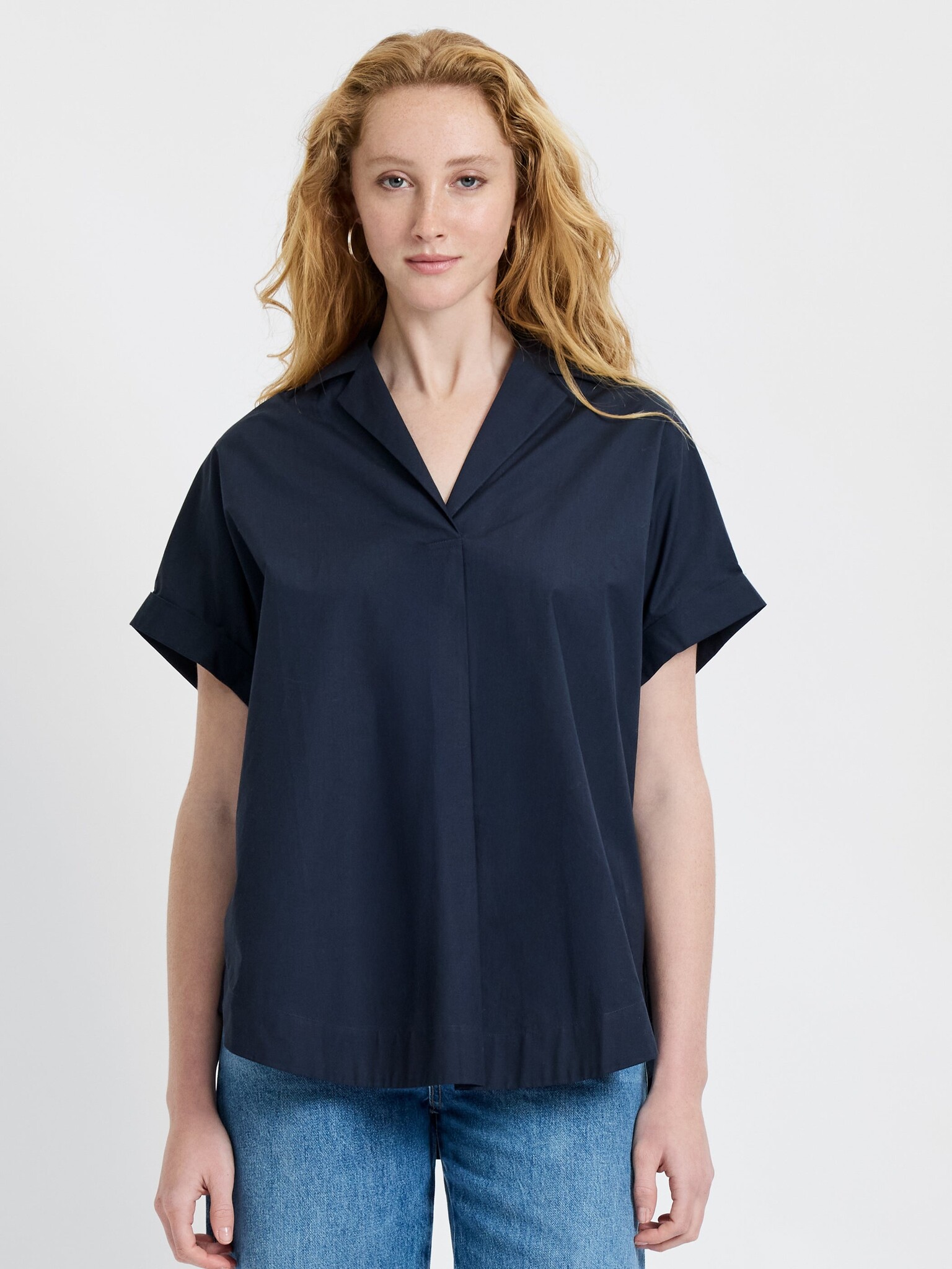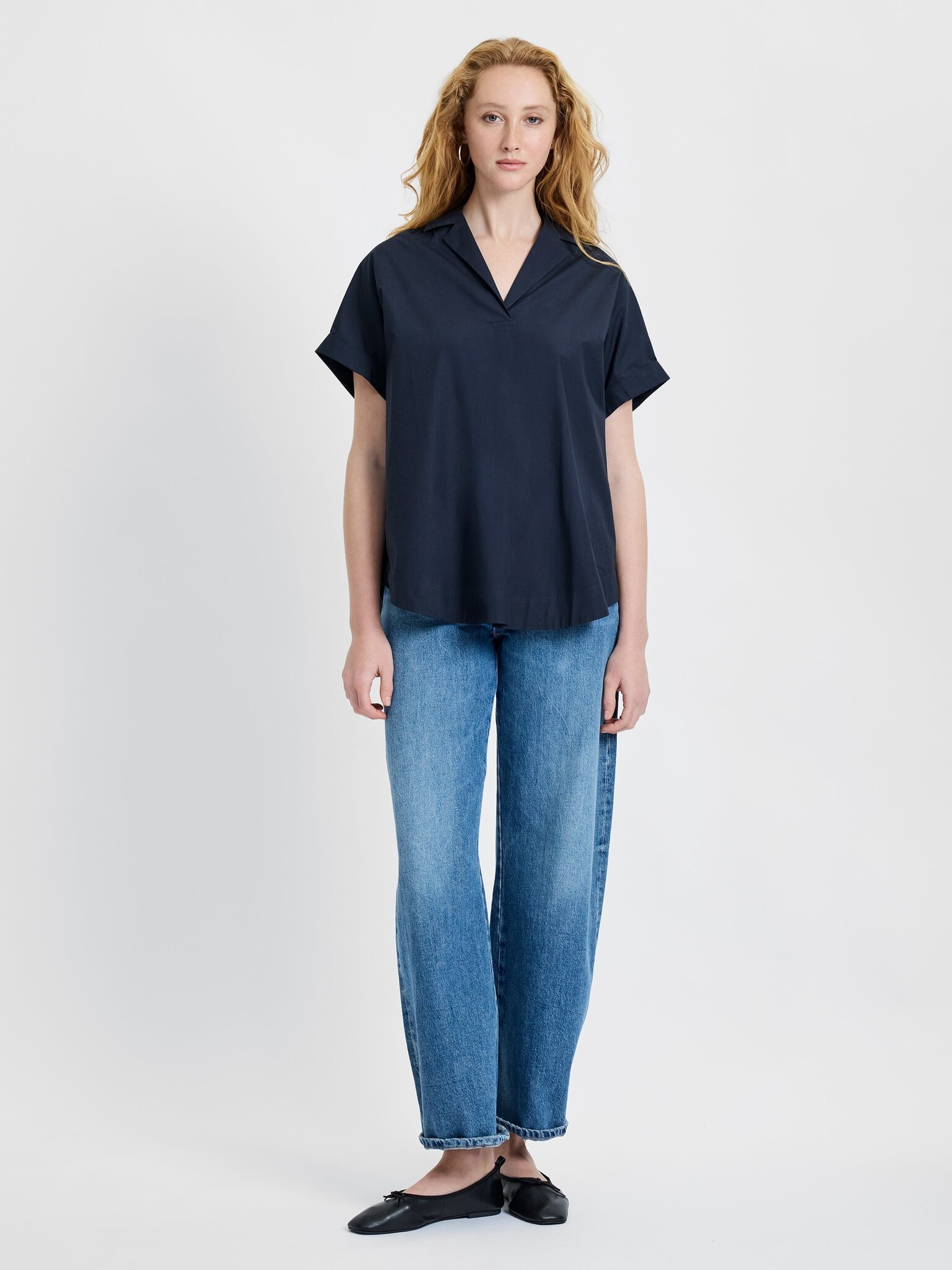 The Poplin Collar Short Sleeve Pullover is cut in a lightweight poplin with a relaxed silhouette that feels effortless but still polished. The soft collar and open neckline keep it refined, while the easy shape makes it one you’ll reach for on repeat.