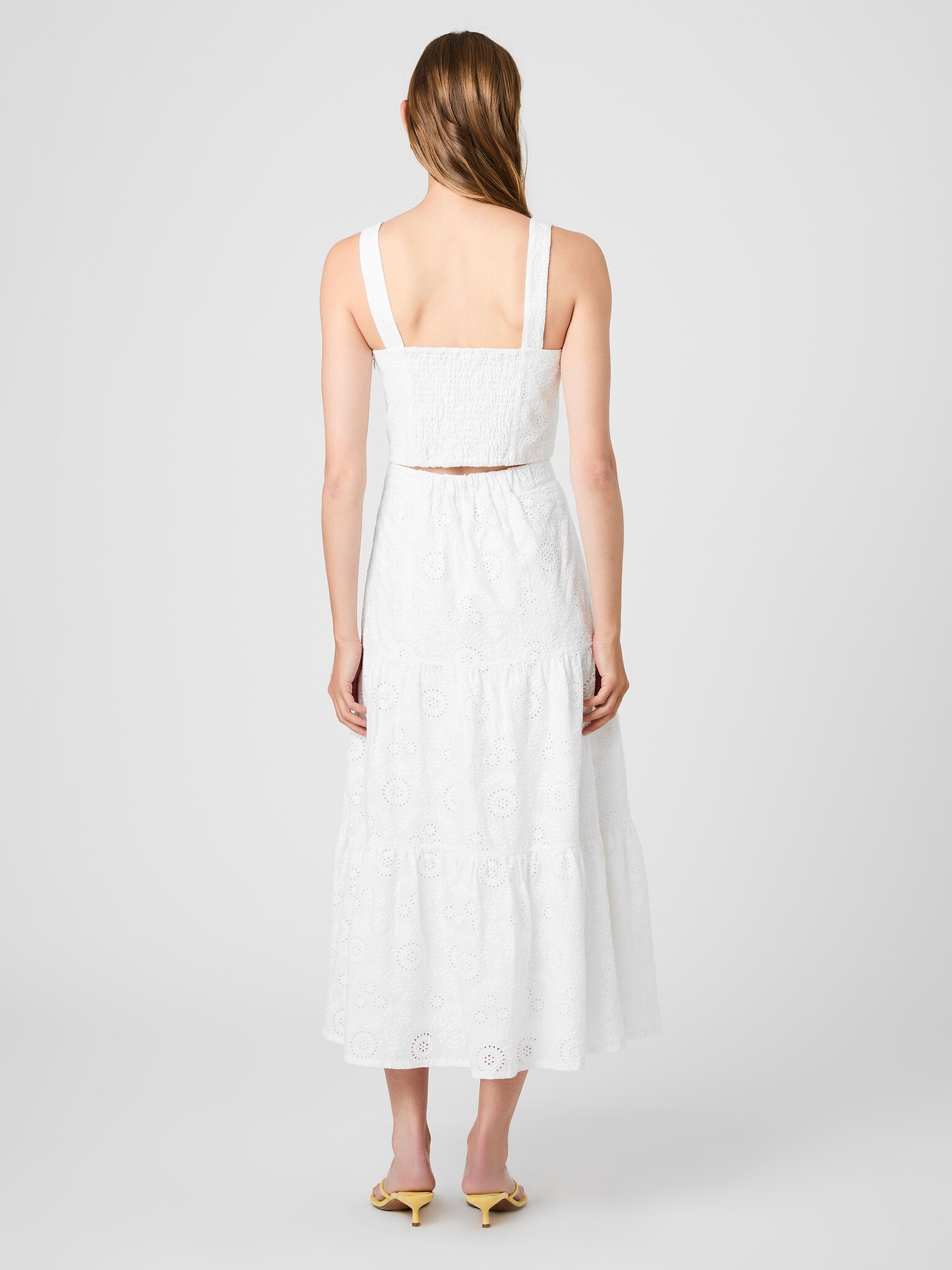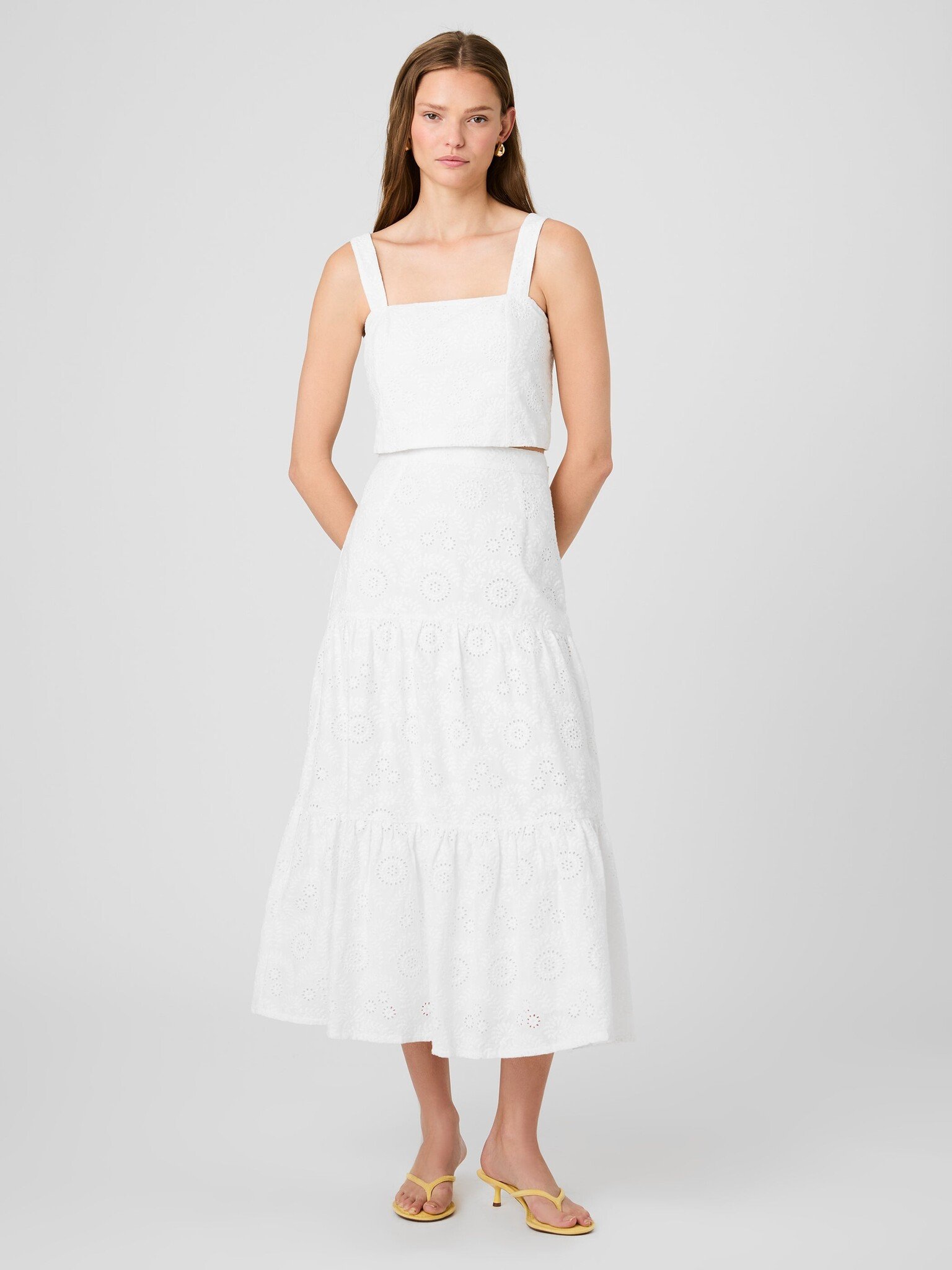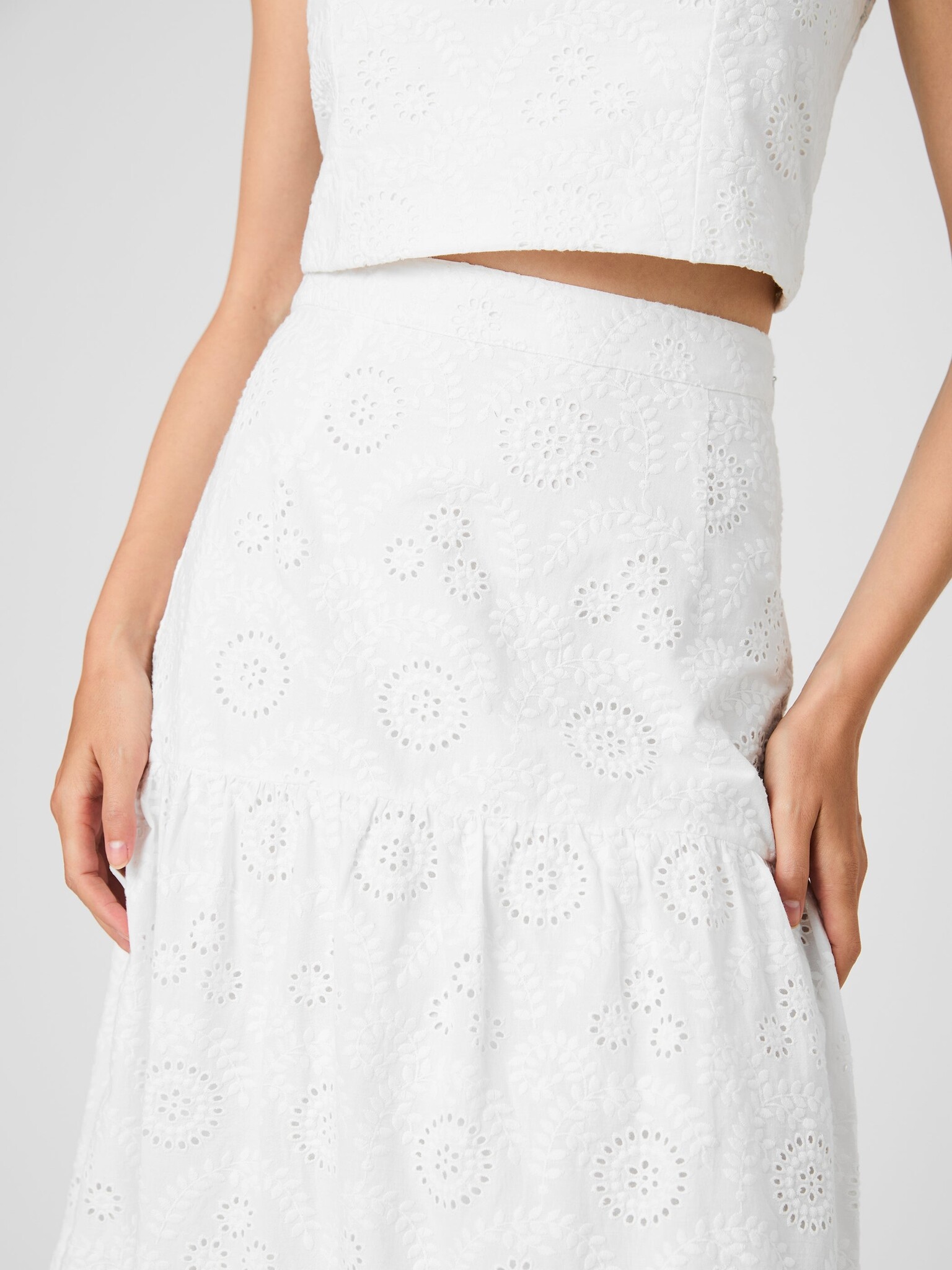 Light, easy, and made for spring. The Svea Floral Eyelet Tier Maxi Skirt features a soft, tiered shape and delicate eyelet design that creates a feminine, flowing silhouette. It feels effortless but still considered.