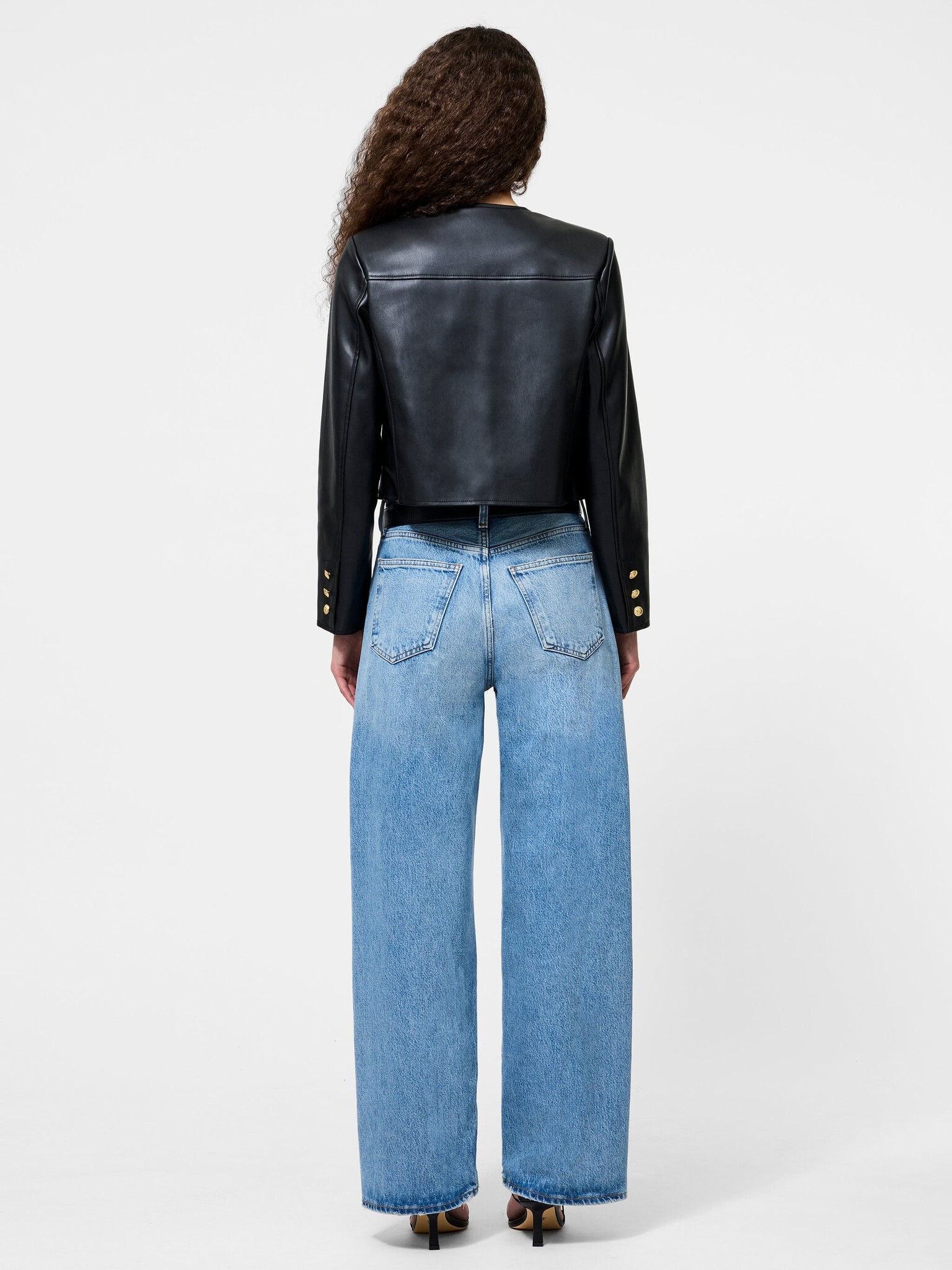 This one goes with everything but feels like a statement. The Dessa Vegan Leather Cropped Jacket is a collarless cropped blazer cut from sleek vegan leather and finished with gold hardware. Pair with the matching skirt or denim.
