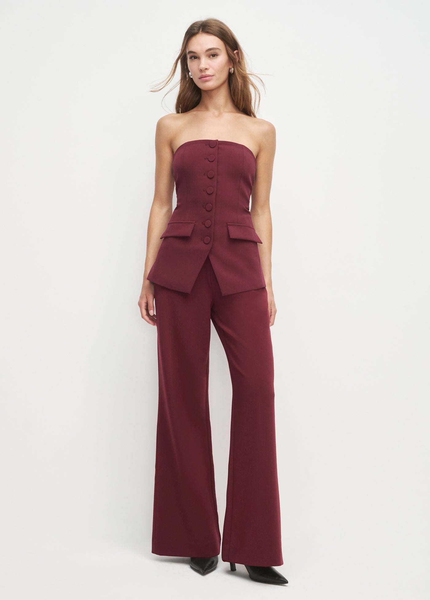 Borrowed from the boys, this bustier in a structured suiting blend Vino has classic menswear styling--structured shape, front buttons, and front flap pockets (plus, a comfortable elastic back!).