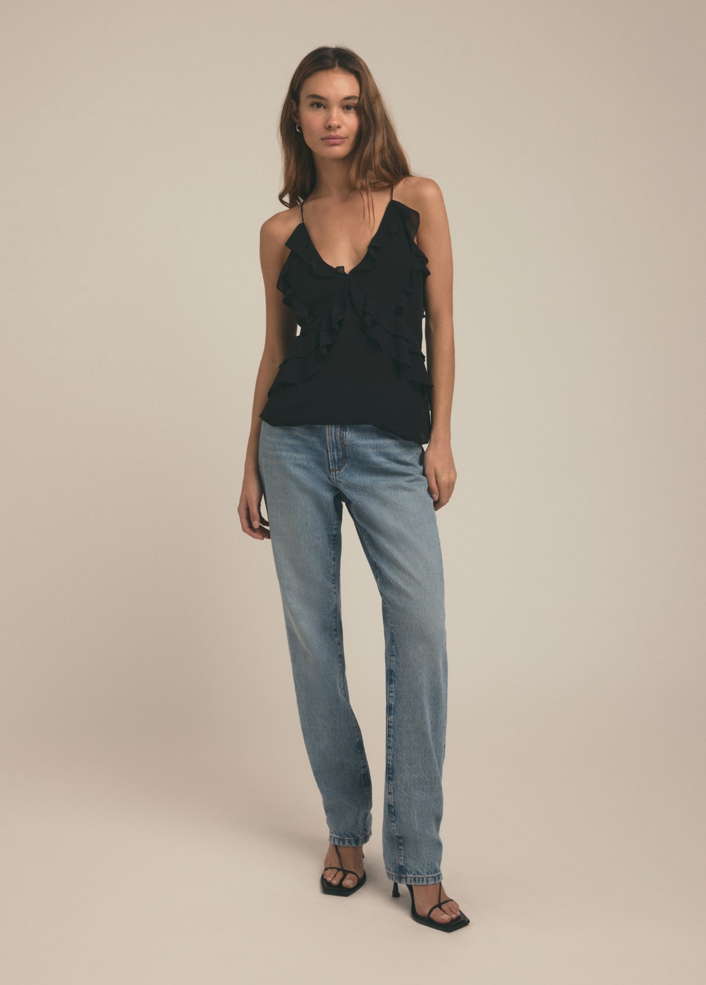 A favorite for the flutter. The Who Me? Top is cut from lightweight chiffon with adjustable pin-thin straps that crisscross at the back. Picot-edge ruffles add subtle texture to the front.