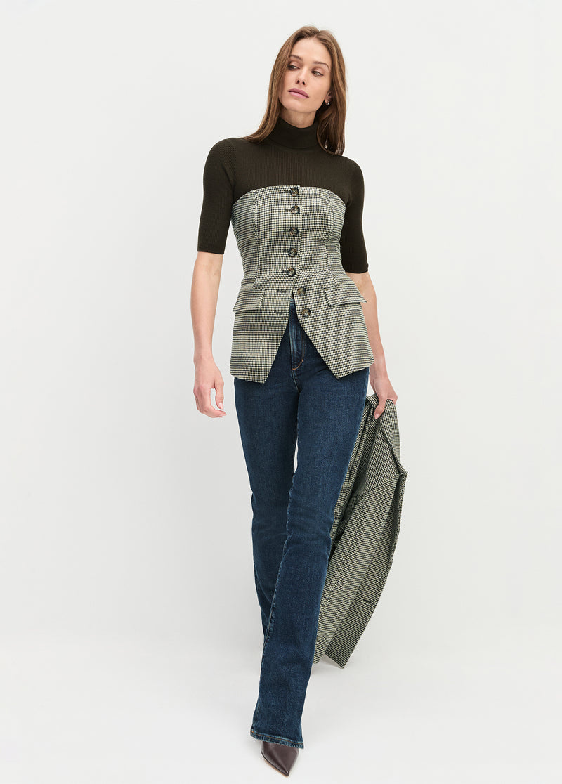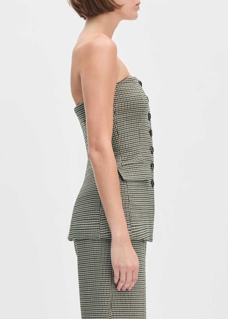 Borrowed from the boys, this bustier in a structured, jacquard-viscose blend Houndstooth has classic menswear styling--structured shape, front buttons and front flap pockets.
