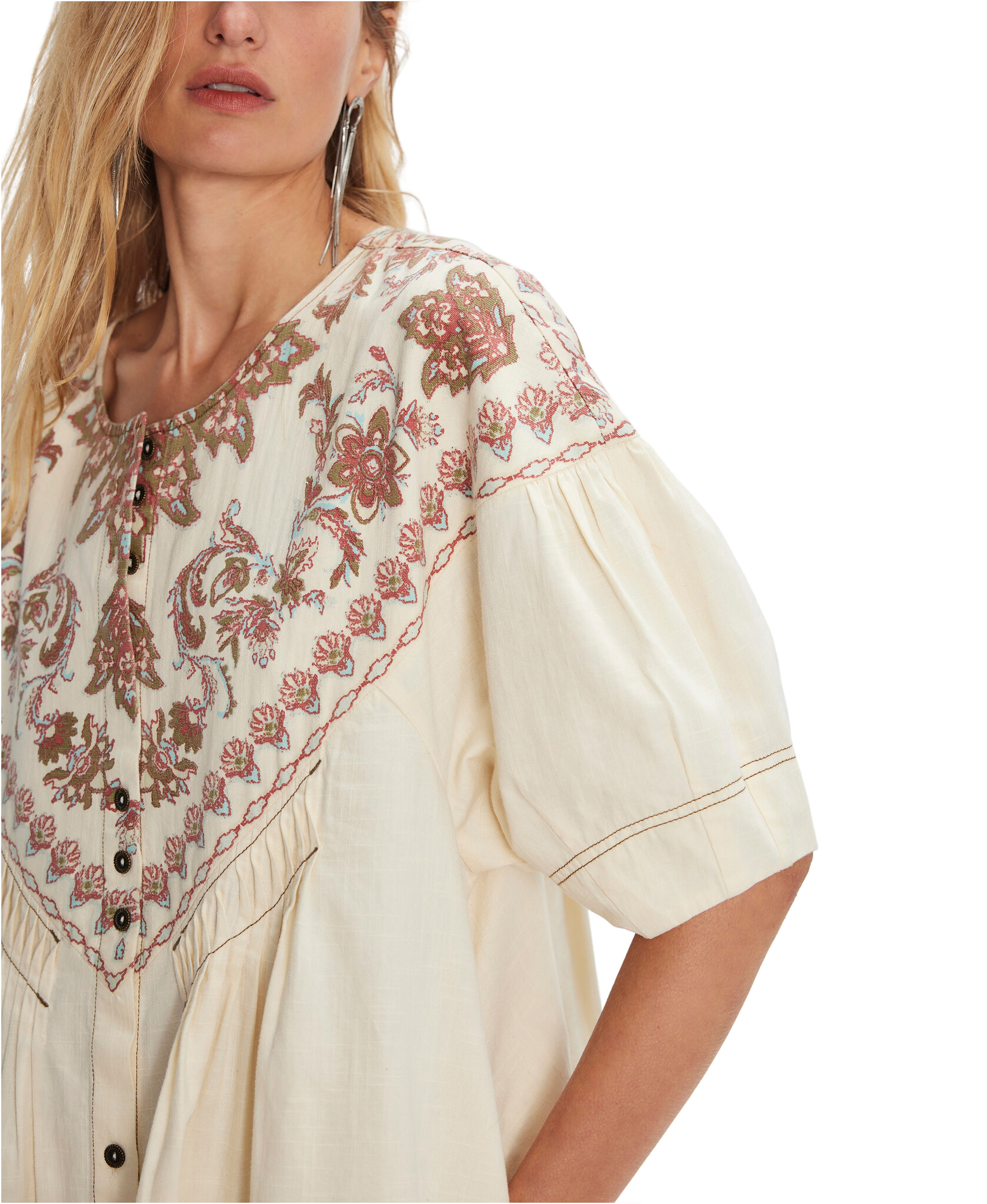 Just as versatile as it is vintage-inspired, this effortless mini dress is featured in a button-front silhouette with defined printing at top and slightly exaggerated sleeves for added shape.