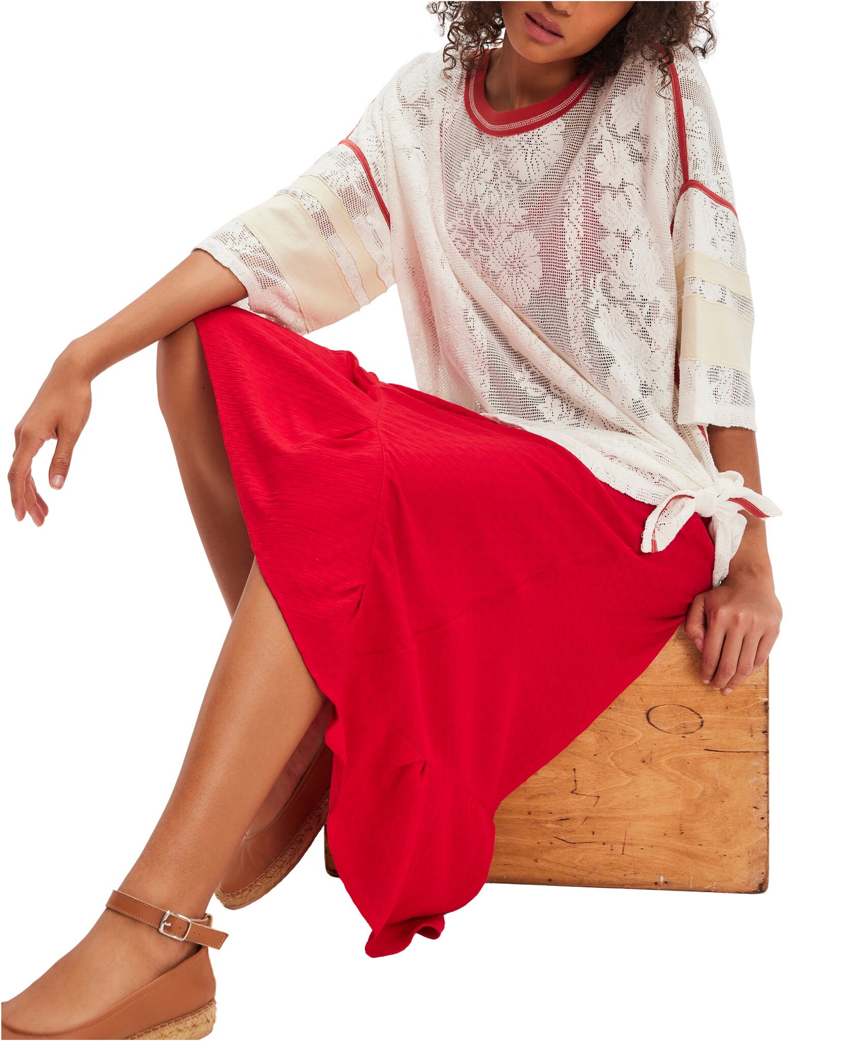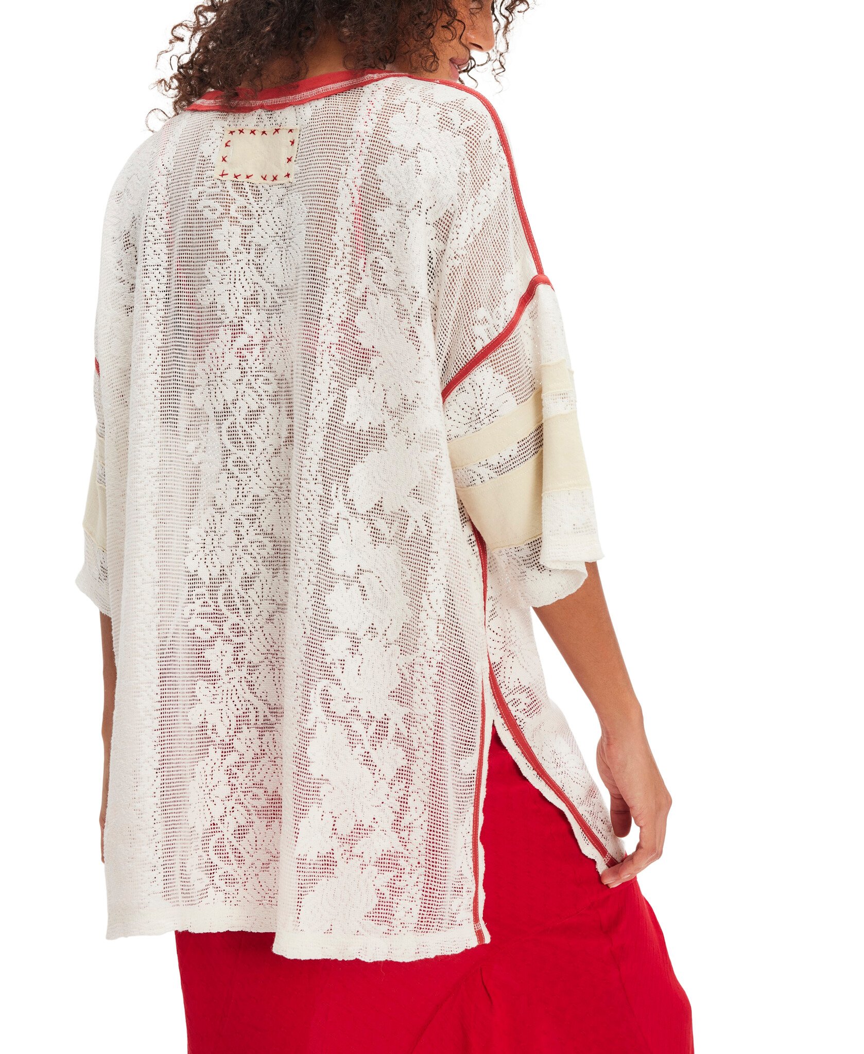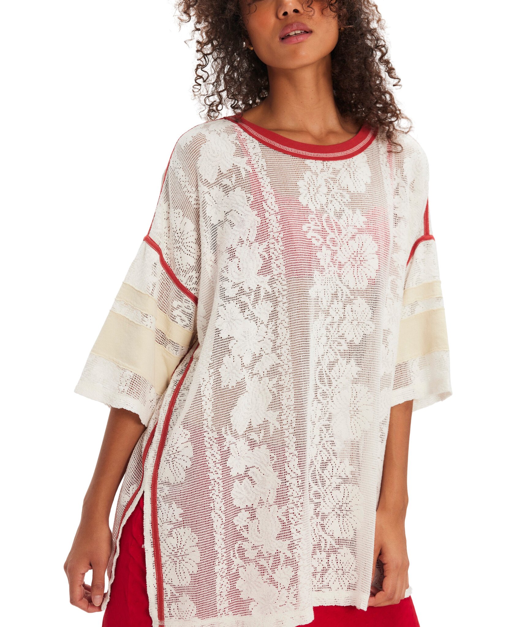 Sporty meets femme with this oversized, jersey-inspired tee from We The Free, featured in a full mesh lace fabrication with contrasting trim and varsity stripe accents.