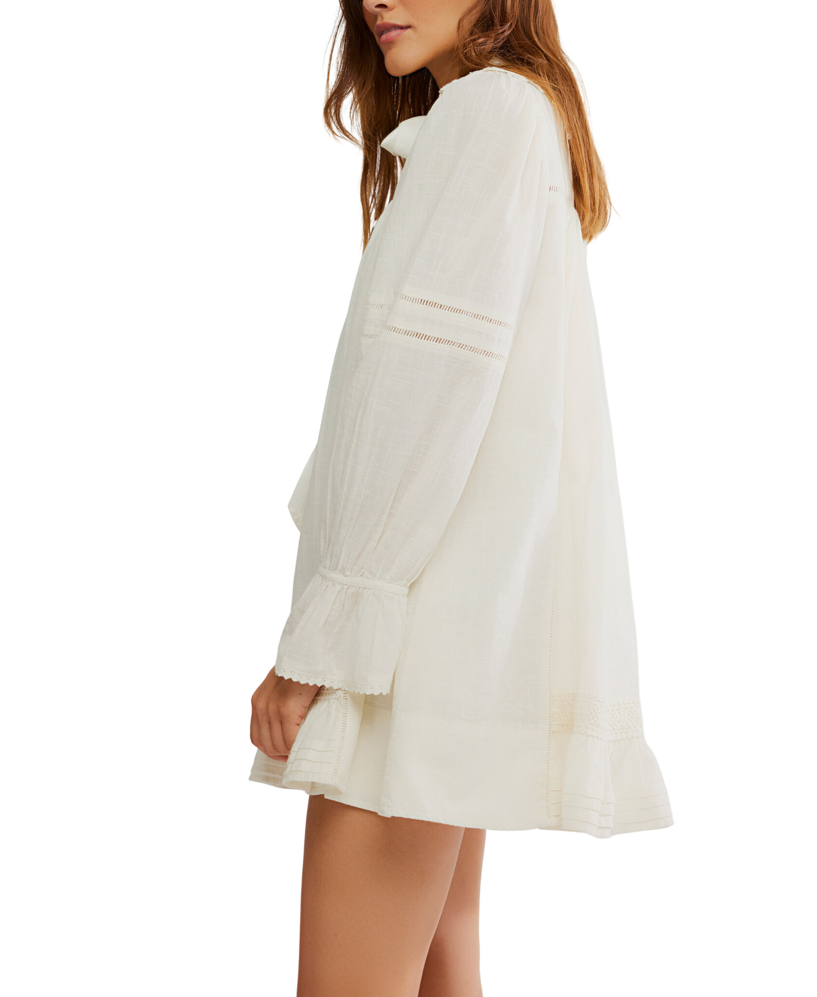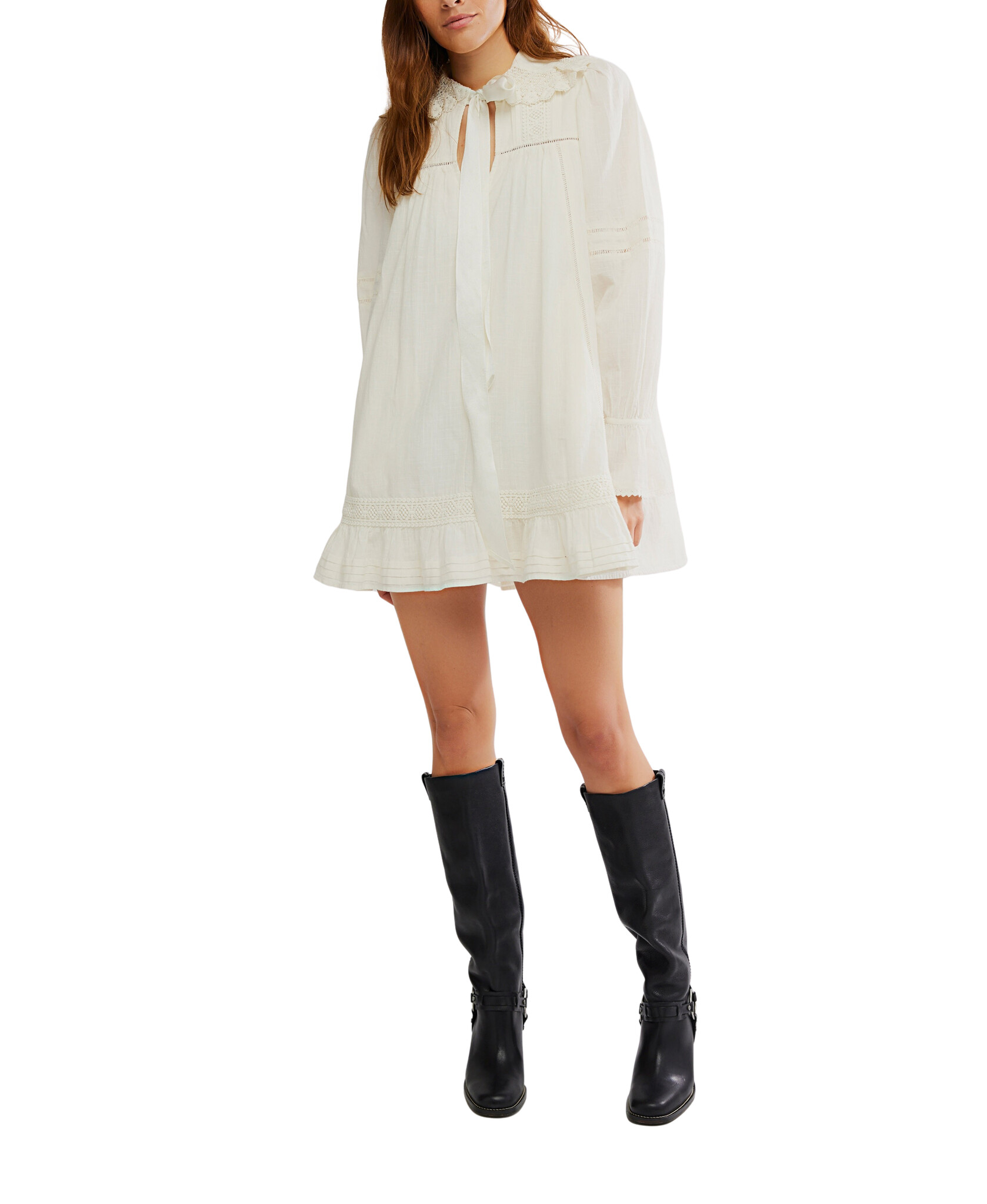 Designed to be a daily staple in your weekly wardrobe rotation, this super versatile, vintage-inspired mini dress features a tie detail at neckline, slightly exaggerated sleeves, and ruffle-adorned detailing for the sweetest finishing touch.