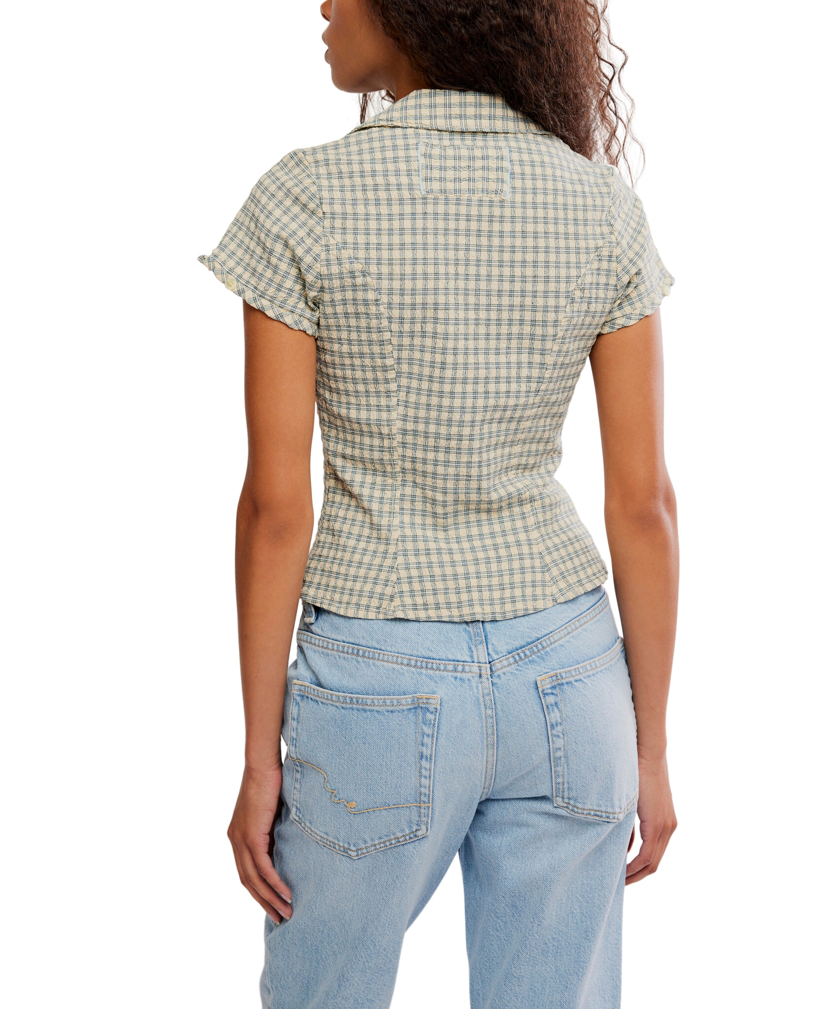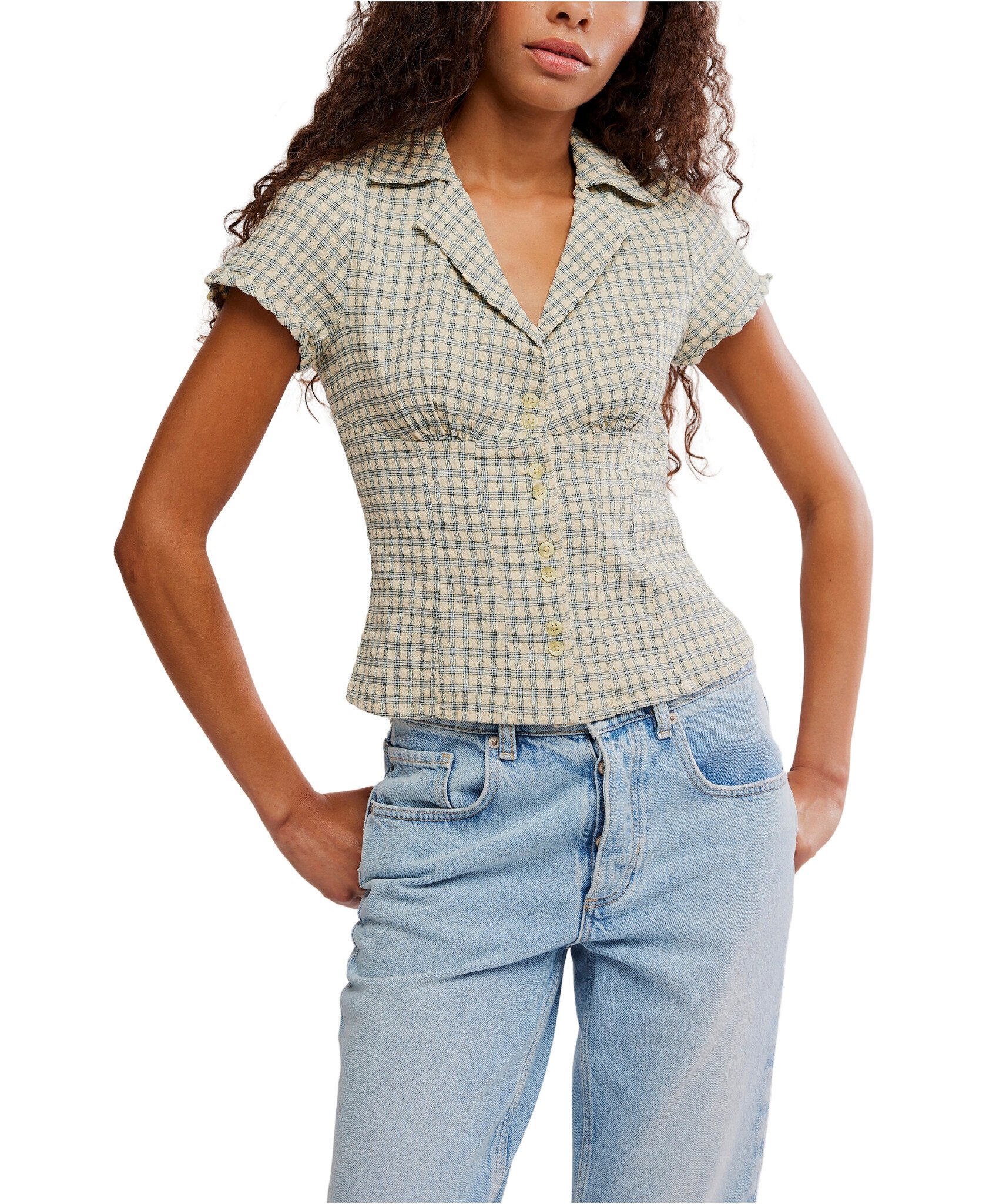 Add that vintage vibe to your look with this button-front top from We The Free, featuring a fitted bodice, ruched underbust, and collared V-neckline for an elevated finish.