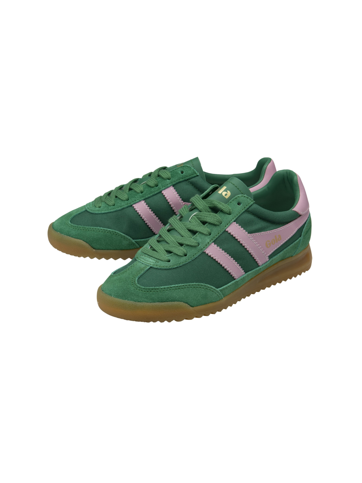A heavy weave nylon upper in emerald is complemented with matching suede trims, heel and lace and contrasted with a candy Gola wingflash side trim. Sat upon a slight wedge gum sole, Tornado offers the full old school sneaker package.