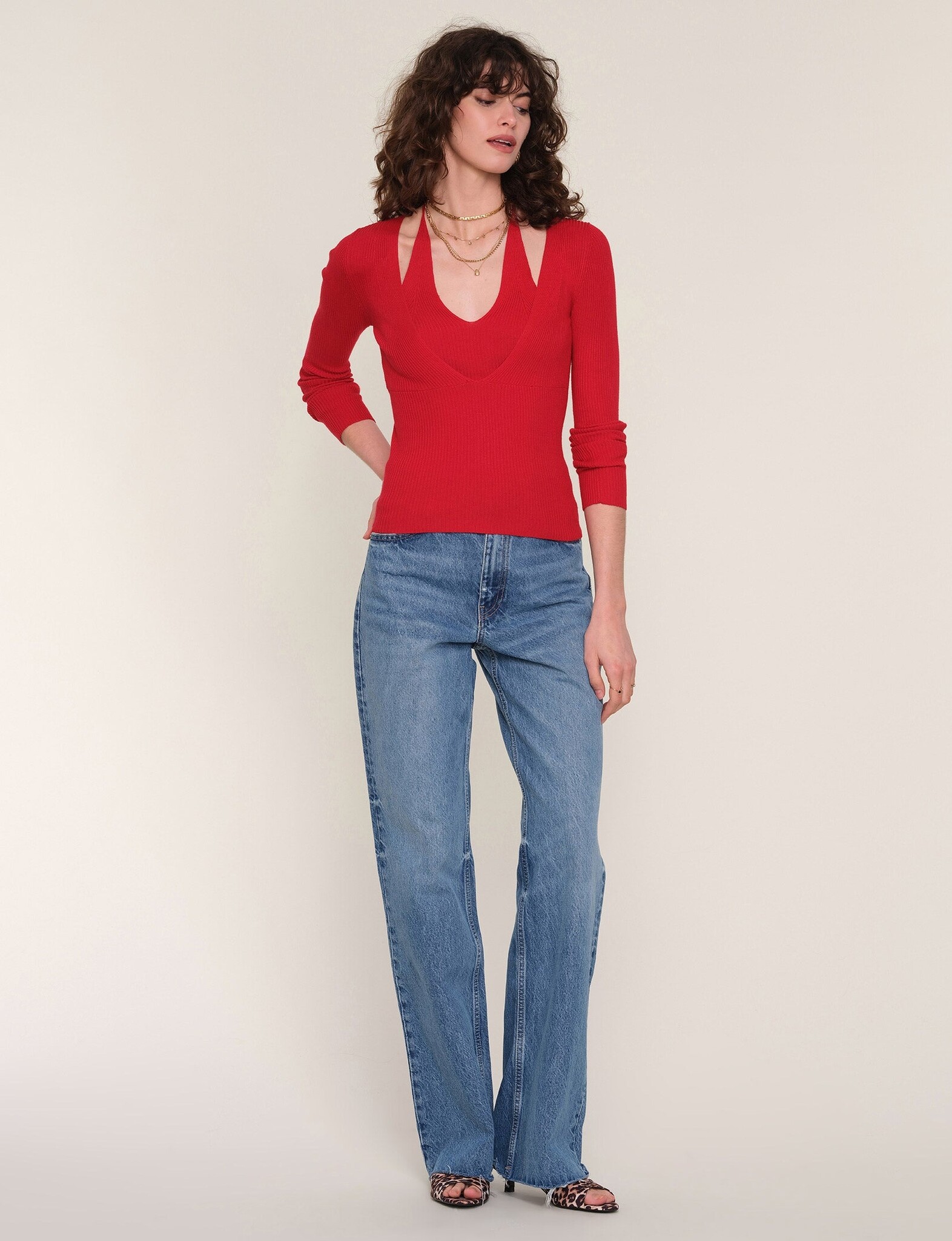 The Twyla Top is a ribbed knit top with a slim fit. It features a double layer look with a halter neck detail.