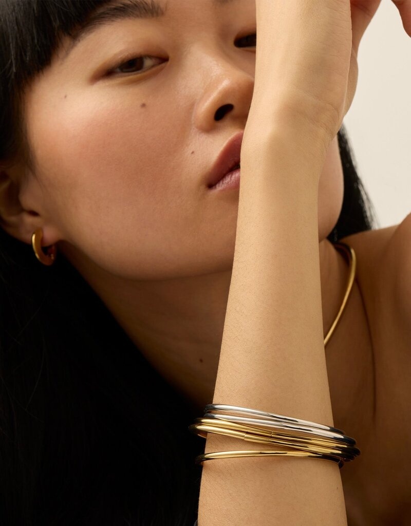 What lightweight stacking dreams are made of. Set of 5 high-shine bangles. This water-durable design brings major impact to your stacking game with zero weight. Dane is super easy to put on and remove.