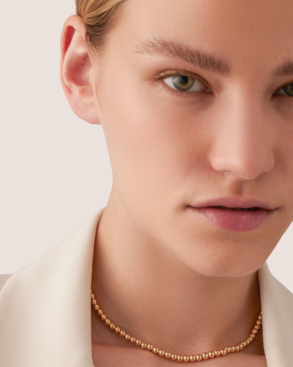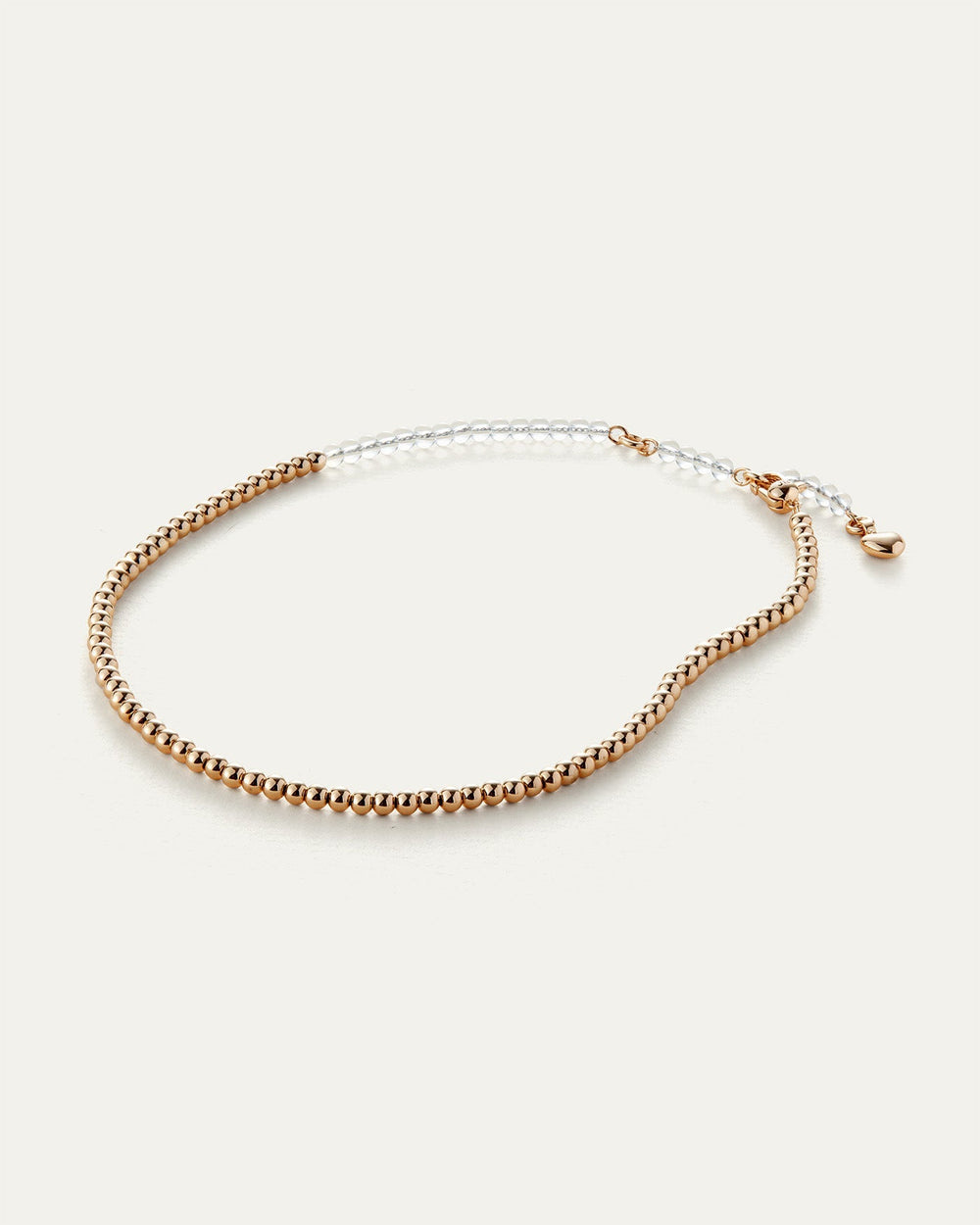 A series of luminous gold and clear, recycled glass spheres are suspended from a delicate curb chain. This design includes two non-removable extender rings, making it easy to wear at three different lengths. Finished in high-polish gold.
