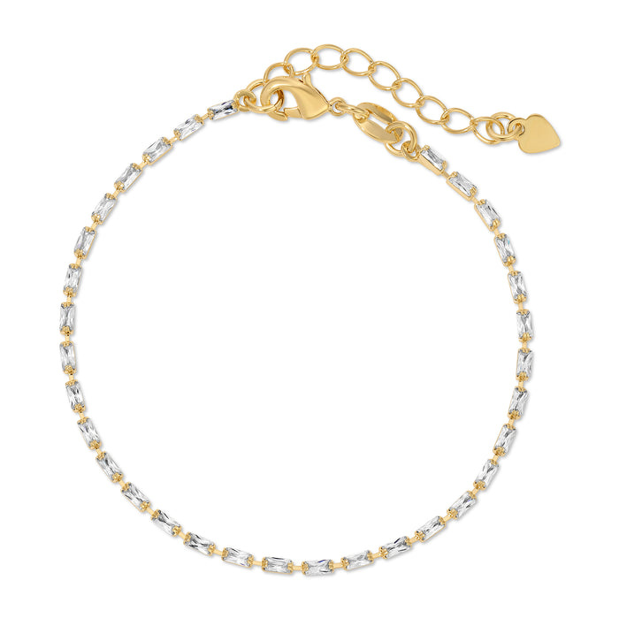 Sleek & sophisticated, this baguette tennis bracelet shines with sparkling cubic zirconia stones set in polished 18k gold. Lightweight & adjustable for the perfect fit, it delivers the right amount of shimmer for both everyday wear and special occasions.