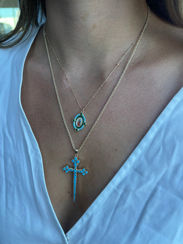 Bring bold color and meaning to your style with this green Guadalupe oval necklace. Framed by shimmering emerald-green and turquoise stones, the radiant enamel centerpiece features a vibrant image of Our Lady of Guadalupe.