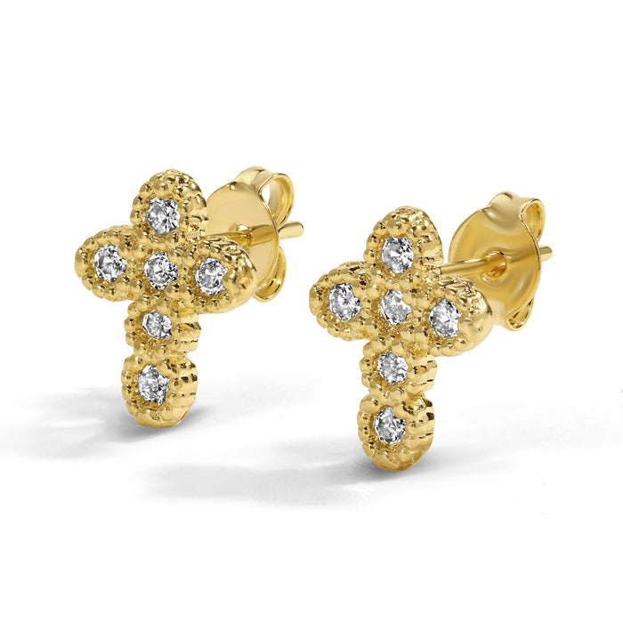 Timeless and radiant, these gold cross stud earrings are accented with sparkling stones for a touch of brilliance. The textured gold setting adds depth and dimension, giving the classic cross design a modern update.