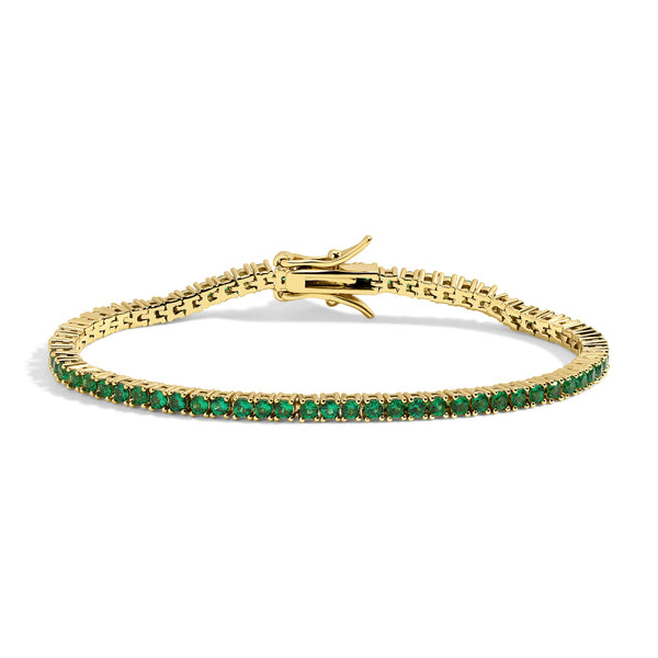 Bring timeless glamour to your collection with this emerald tennis bracelet in yellow gold. The lush green stones offer striking contrast and brilliance, perfect for adding a touch of luxury to any outfit.