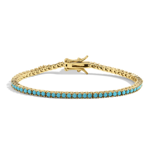Add a pop of color with this turquoise tennis bracelet, beautifully set in glowing yellow gold. The vibrant blue stones bring a playful yet polished look that’s perfect for layering or wearing solo.