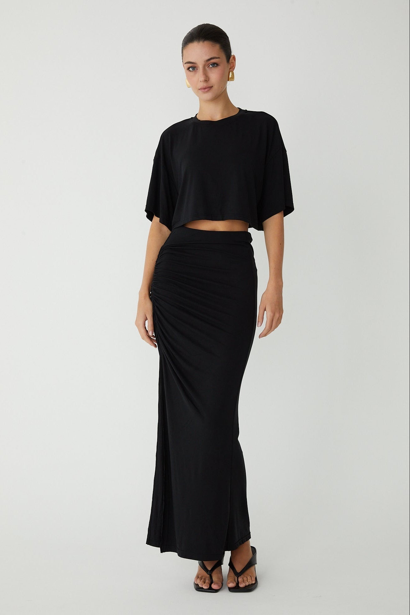 Crafted from luxuriously soft modal fabric, the Gemma Set delivers effortless elegance as a coordinated two-piece set. The top features a refined boxy silhouette, while the high-waisted skirt offers versatile styling options to flatter.