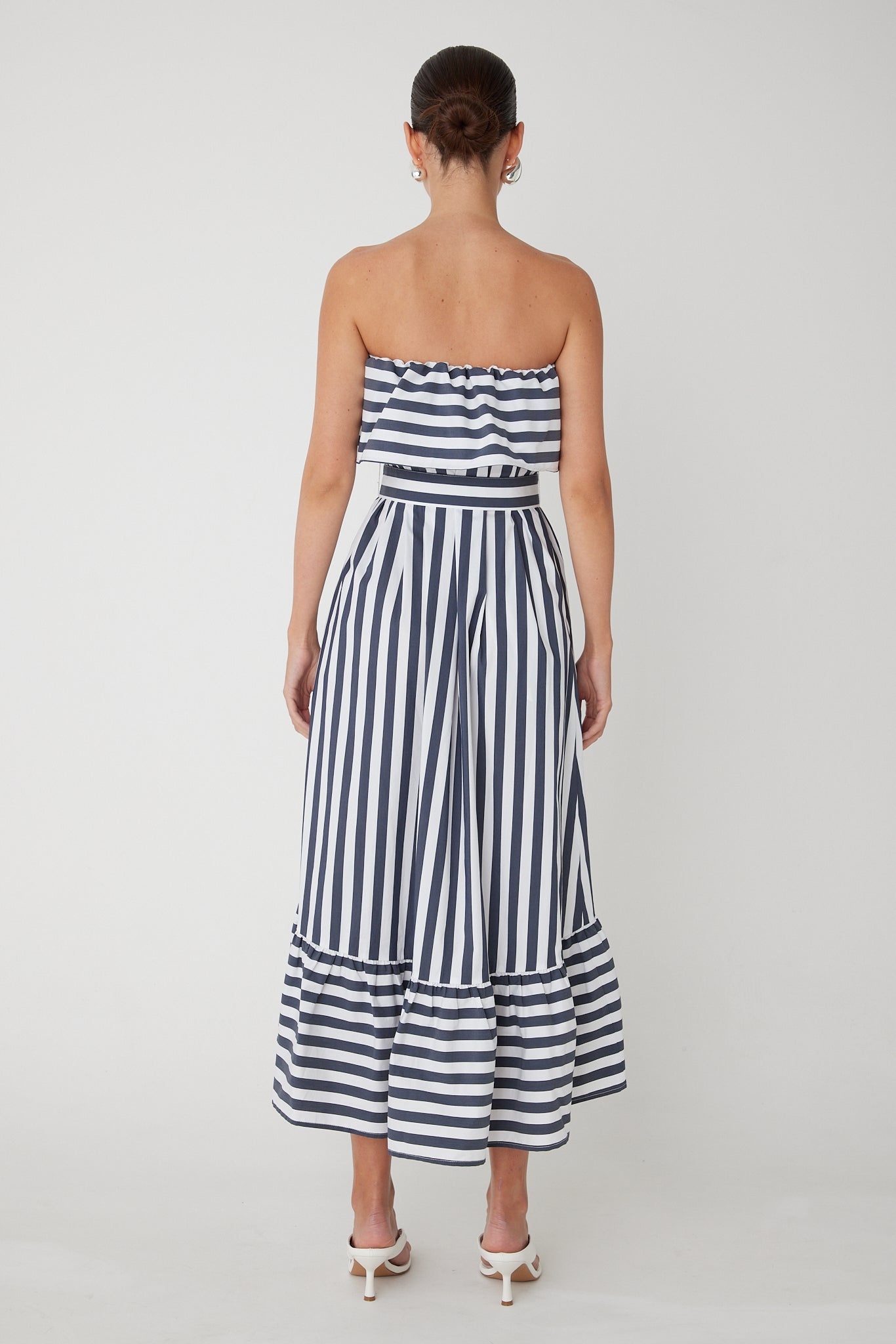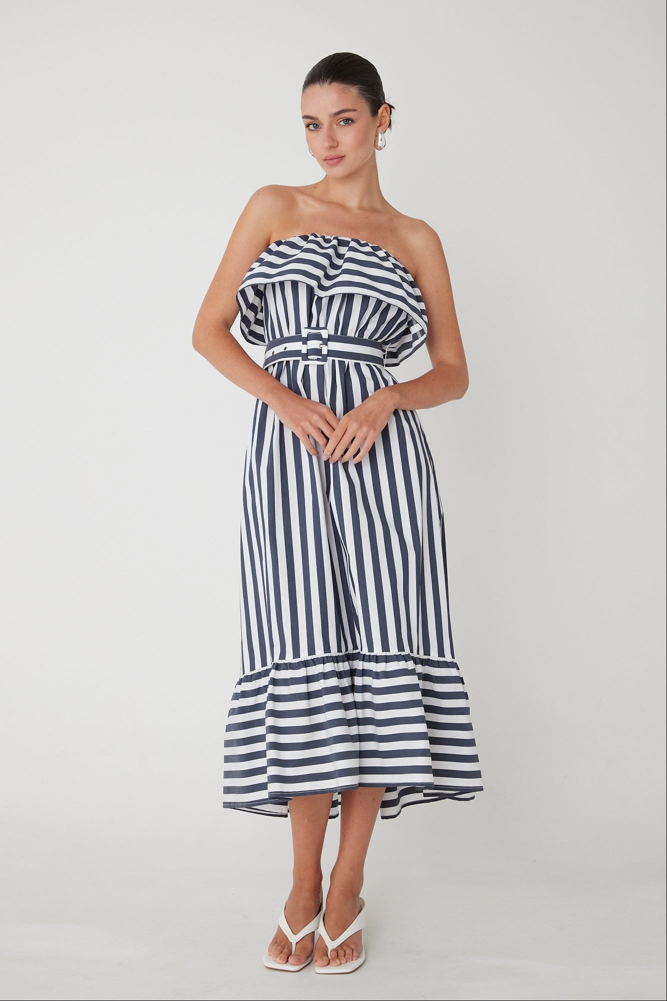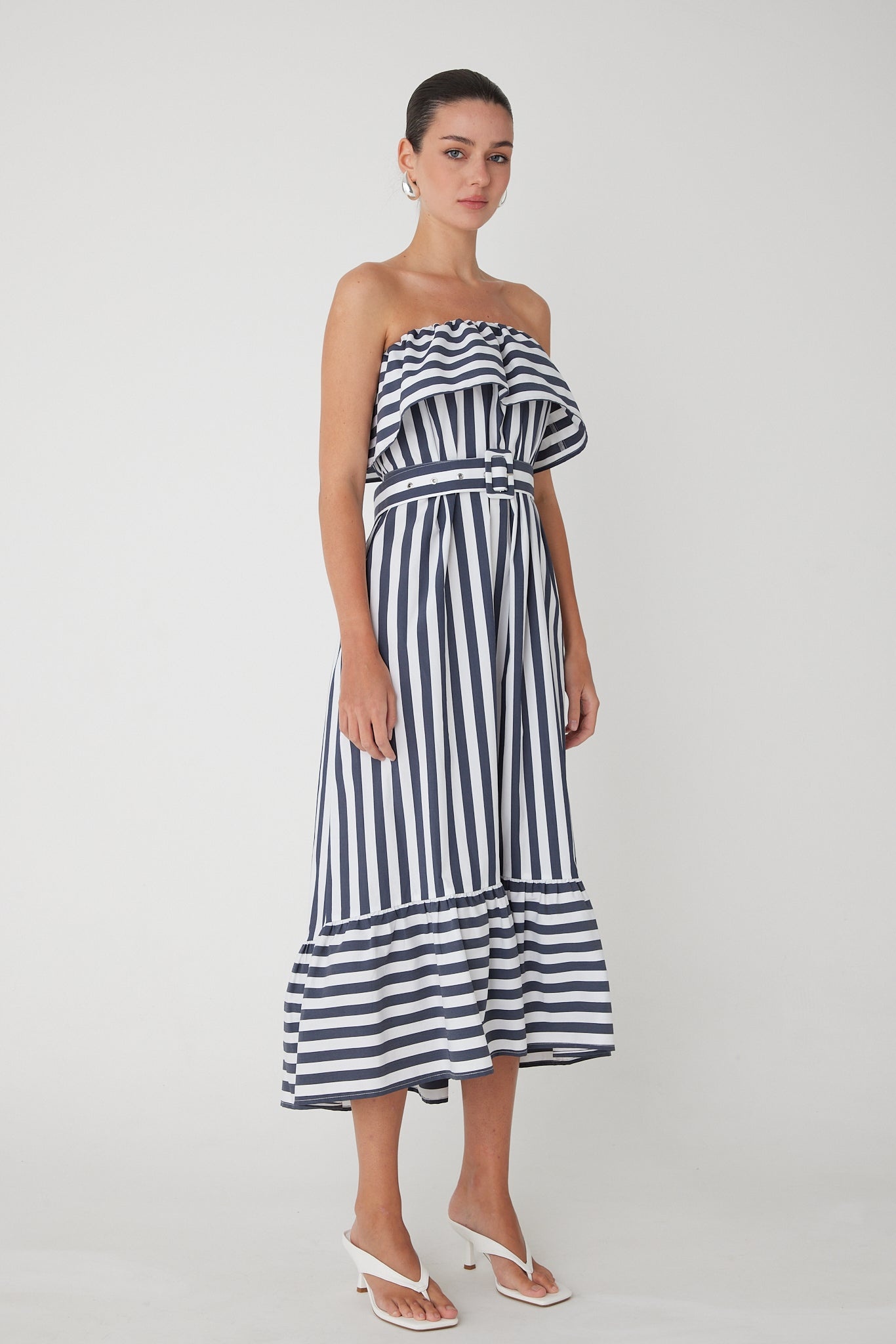 Crafted in crisp white and wide-striped poplin, the Karoline dress offers versatile styling for any occasion. Wear it cinched with the included belt for definition or unbelted for an effortless, flowing silhouette.