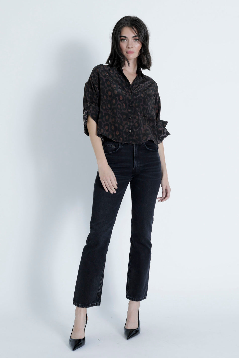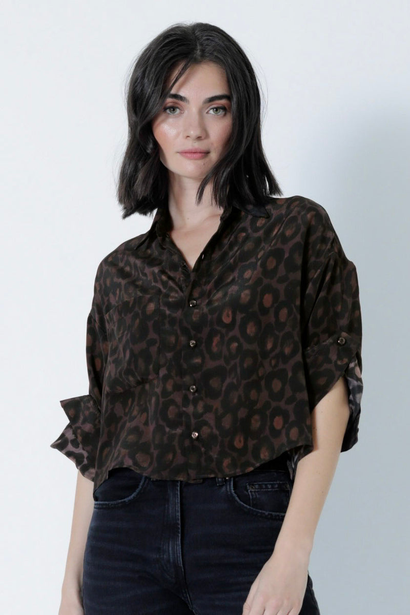 The Malaga Shirt features a pointed collar and a single chest pocket, enhanced by a striking dark cheetah print. Its rolled short sleeves create a relaxed, effortlessly cool vibe. With a slightly boxy, cropped fit.