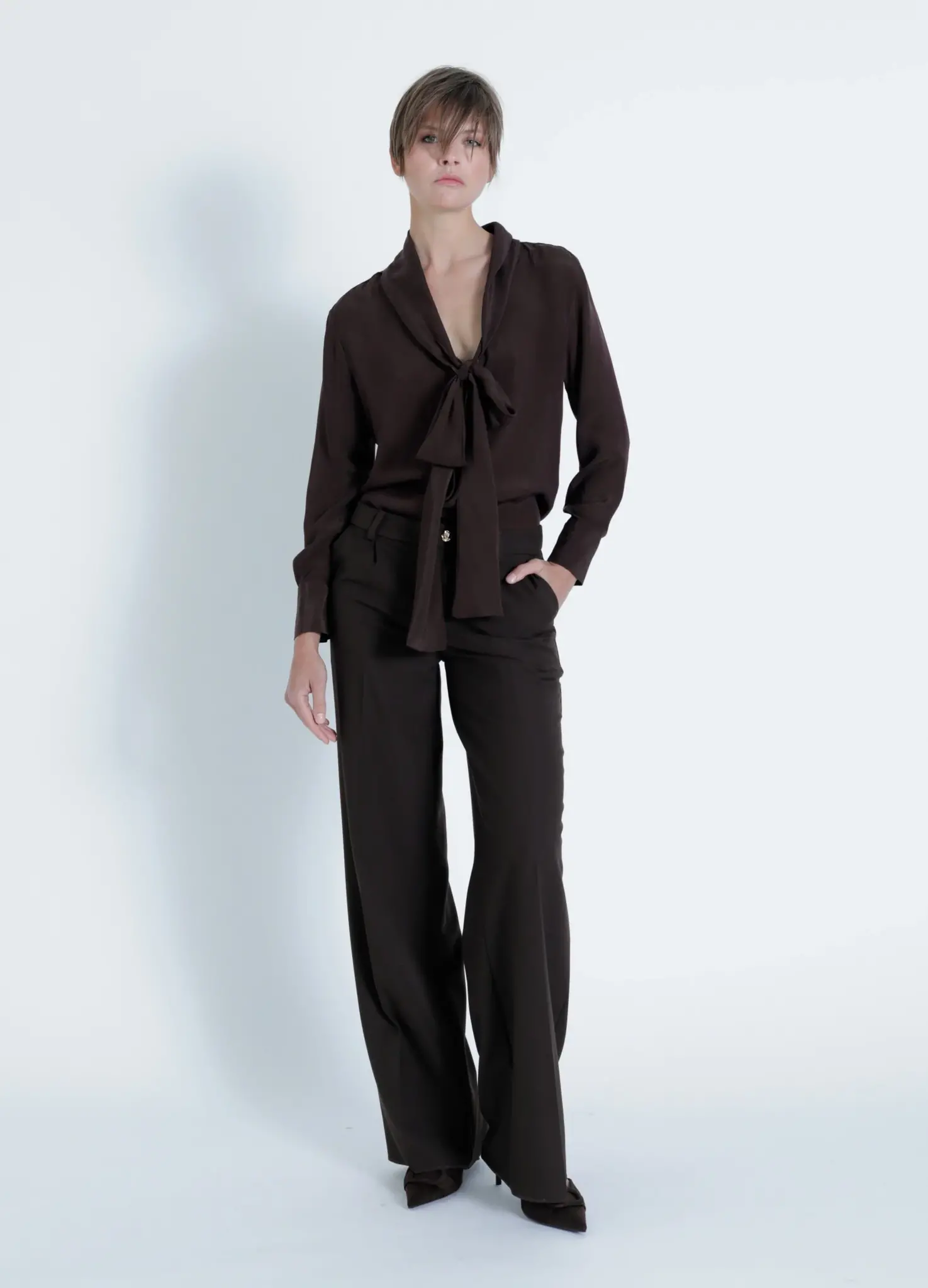Elevate your wardrobe with the Samantha Tie Front Blouse, featuring elegant long sleeves and a chic tie detail at the front. This versatile blouse combines sophistication with a modern twist.