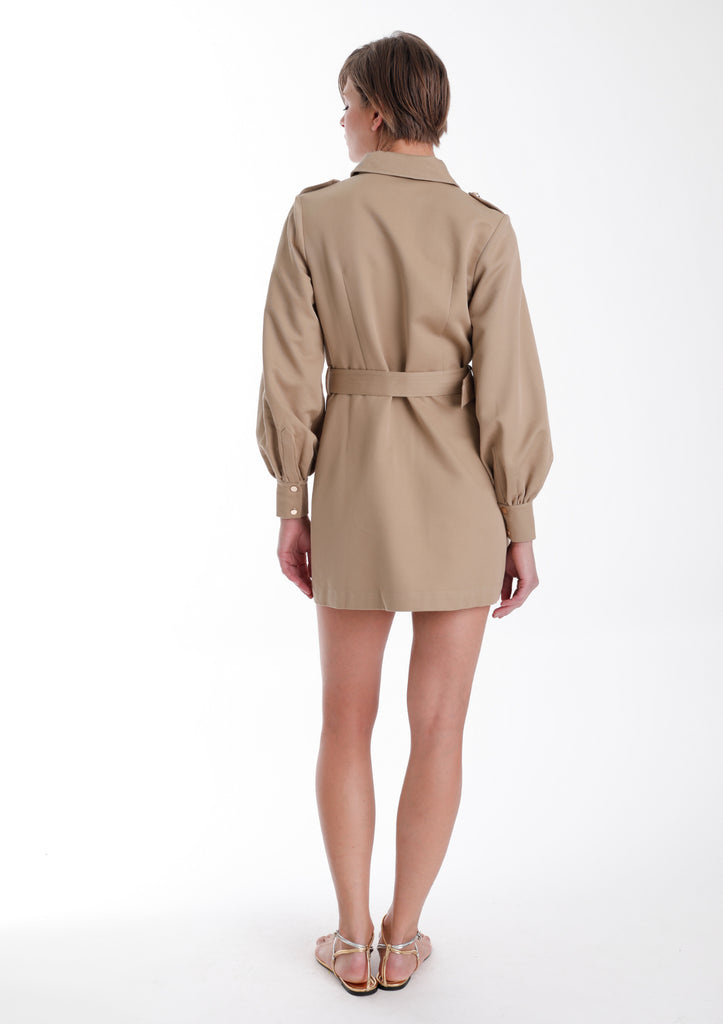 This long sleeve mini dress blends tailored structure with effortless sophistication. Featuring a clean collared neckline, concealed button placket, and a matching belt that defines the waist, it’s finished with statement flap pockets and puffed sleeves.