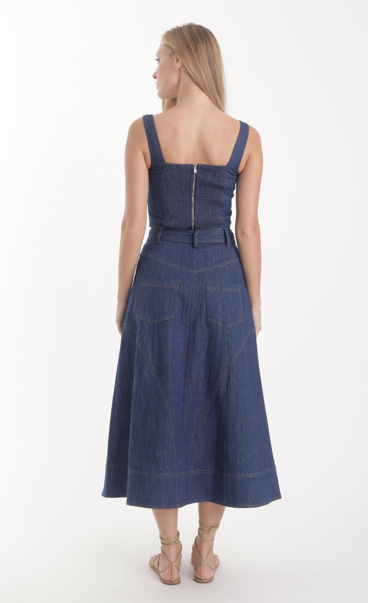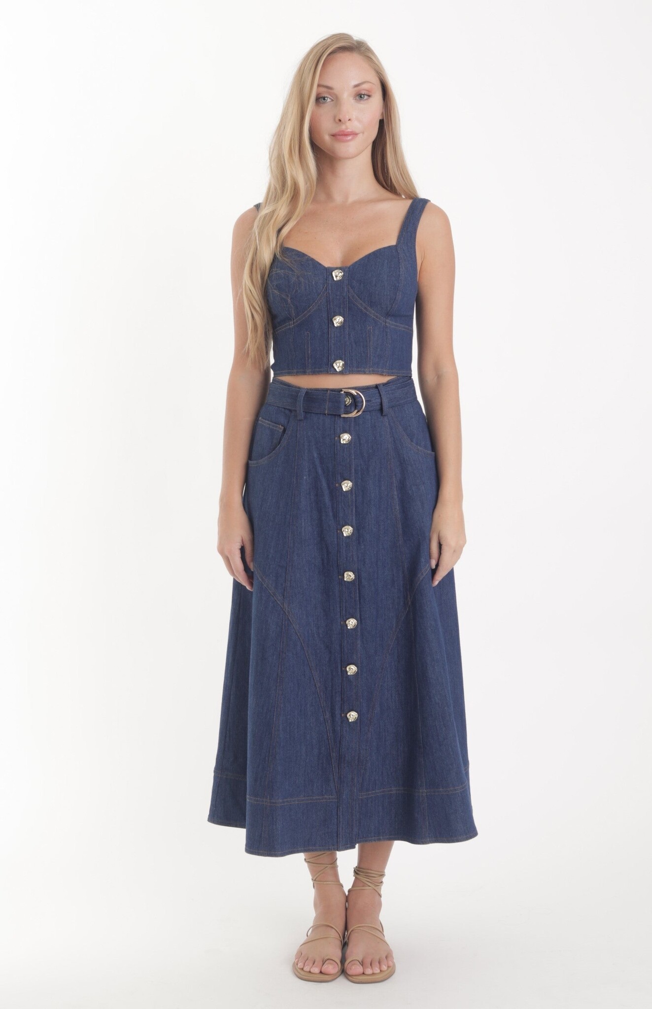 A timeless staple designed with a modern edge. This high-waisted denim skirt features a flattering, structured fit that hugs in all the right places before flowing into an elegant midi silhouette.