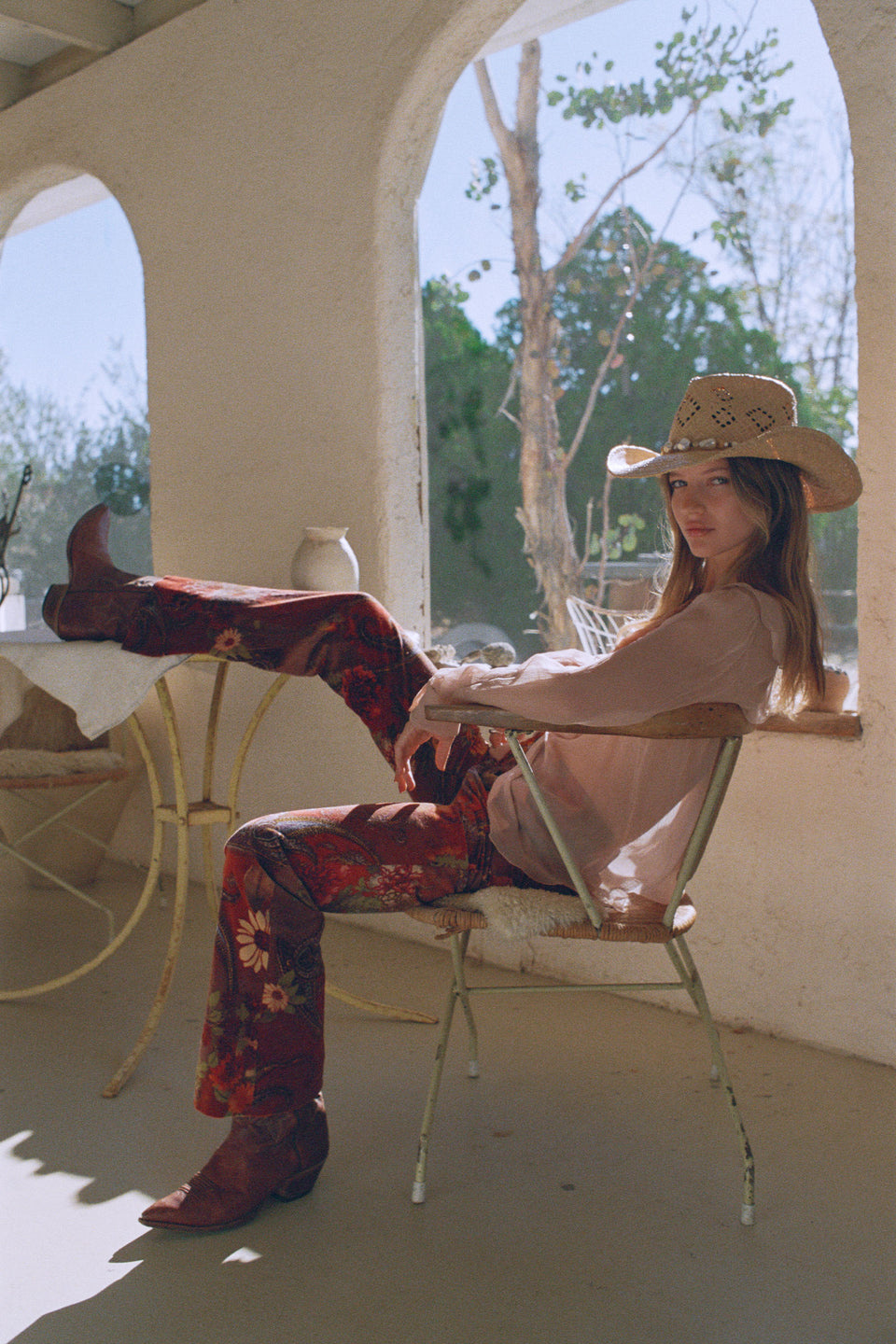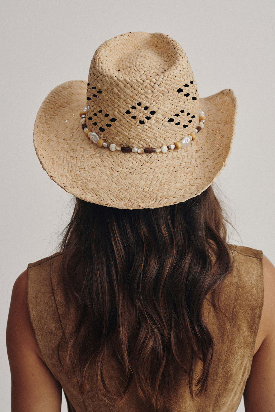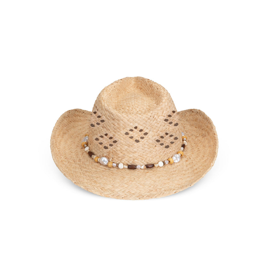 The Sol Cowboy hat takes Western vibes to the next level with a mix of wooden beads and pearl-look accents. Handwoven in raffia, it’s the ultimate coastal cowgirl accessory.