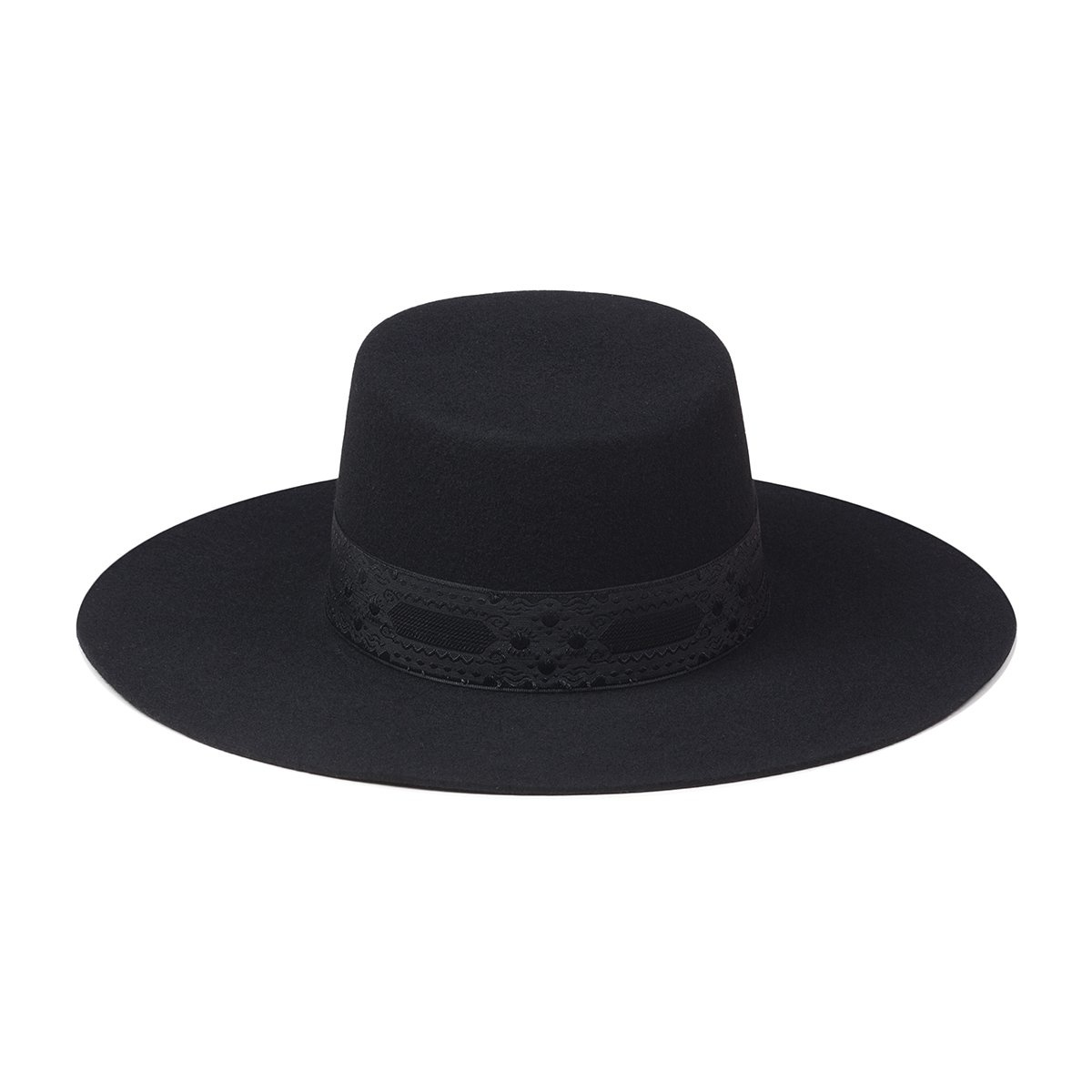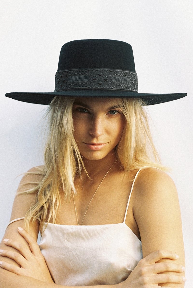 This is chic personified (in a hat). This wide brimmed boater style is the luxury you've been waiting for and will transform any outfit. Features patterned vintage ribbon.