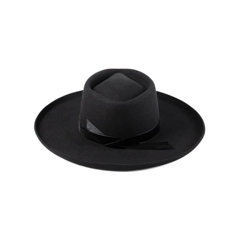 - Black vintage classic diamond crown hat with flicked edge, trimmed with vintage black velvet with sewn back detail.