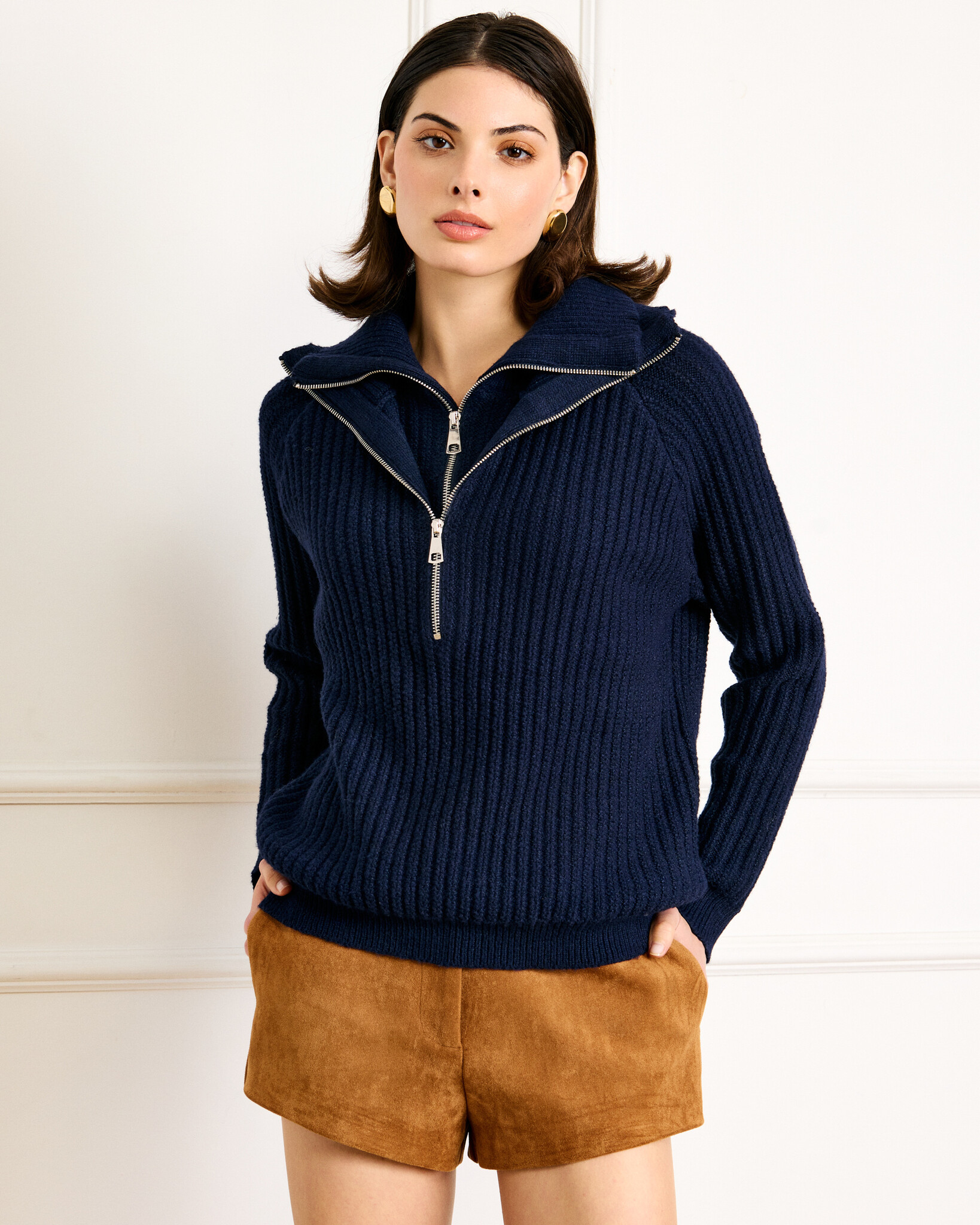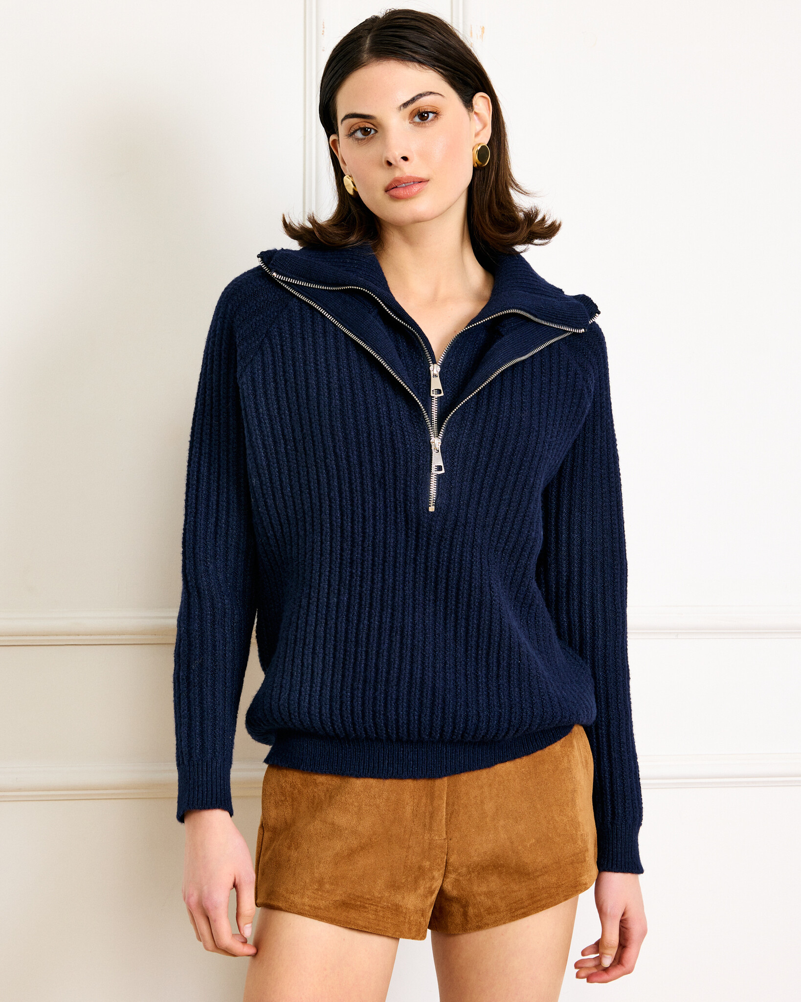 Double zippers accentuate the Hendrix Sweater, a favorite rib-knit sweater in a gorgeous navy.