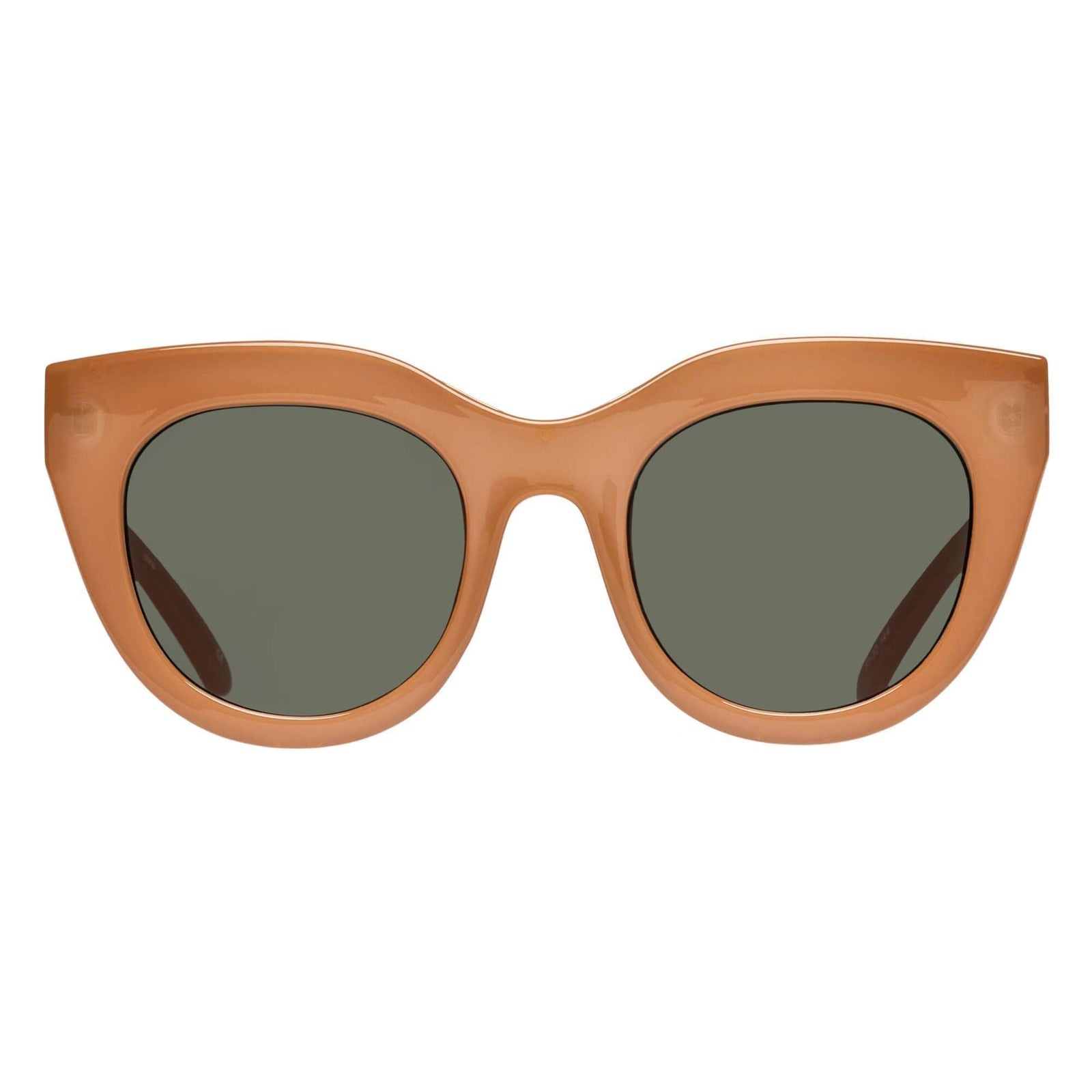 With oversized and dramatic proportions reminiscent of a cat eye, the style is designed with a thick caramel frame and luxurious metal top bar inlay, then fitted with premium zero base khaki grad flat lenses.