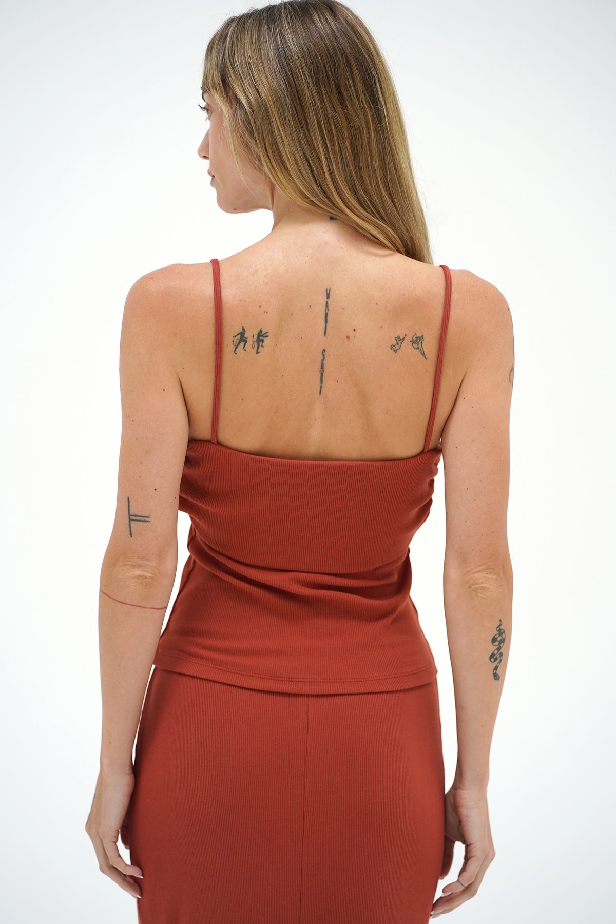 The Lanai is a 2x1 ribbed tank with a straight neckline, double layered top, and side ruching. Pair with the Steph Ribbed Skirt for a full look.