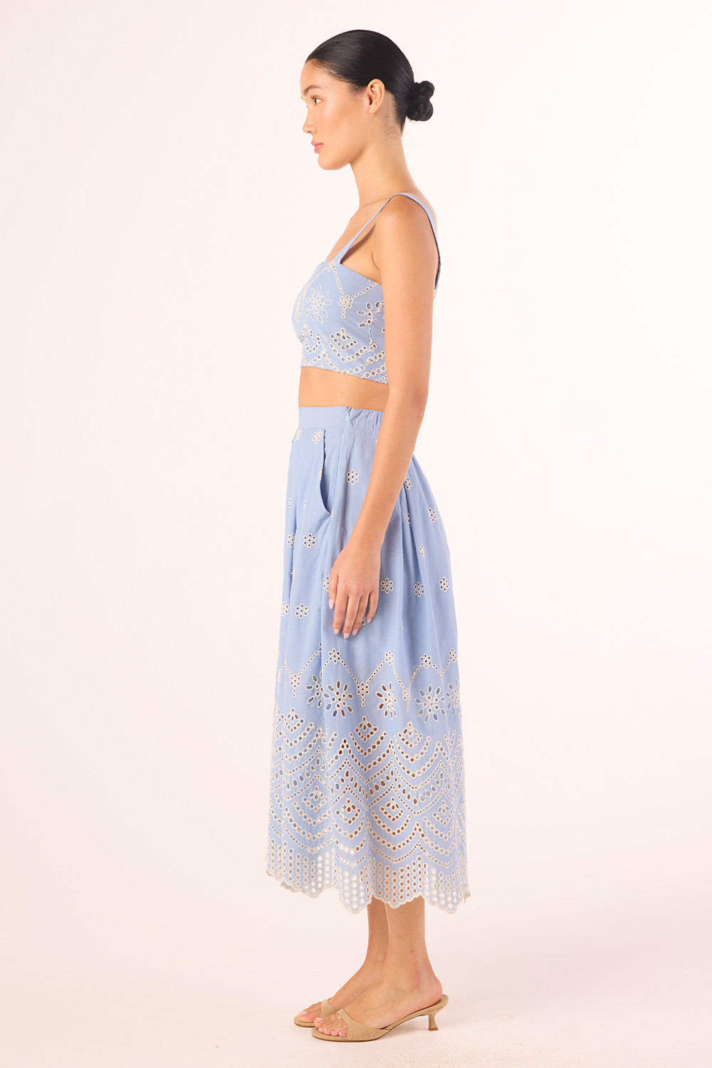 Aggie is a chic midi length skirt cut from a fresh eyelet periwinkle cotton. Featuring structured pleats and a banded waist and elasticated back with side slit pockets and a hidden side zip closure. Finished with a feminine scalloped hem.