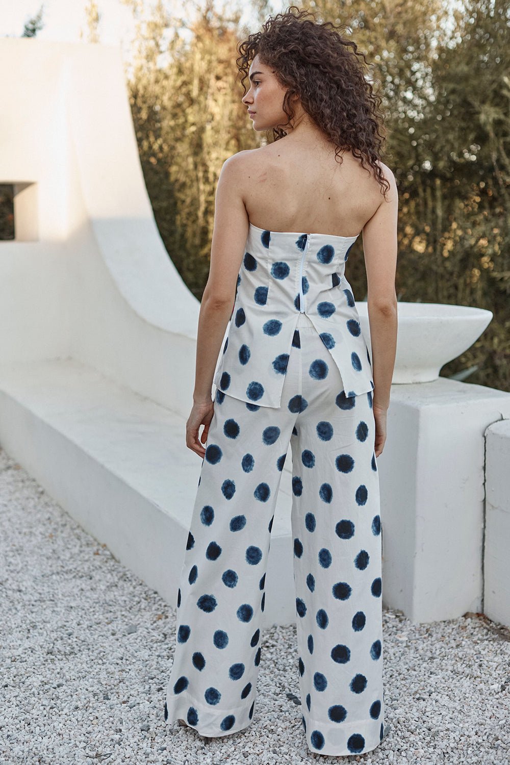 The Yassi top is a modern strapless silhouette cut from large-scale navy polka dot–printed cotton poplin on a white ground. Fitted through the bust, it falls straight to below the hips for a relaxed, elongated shape.